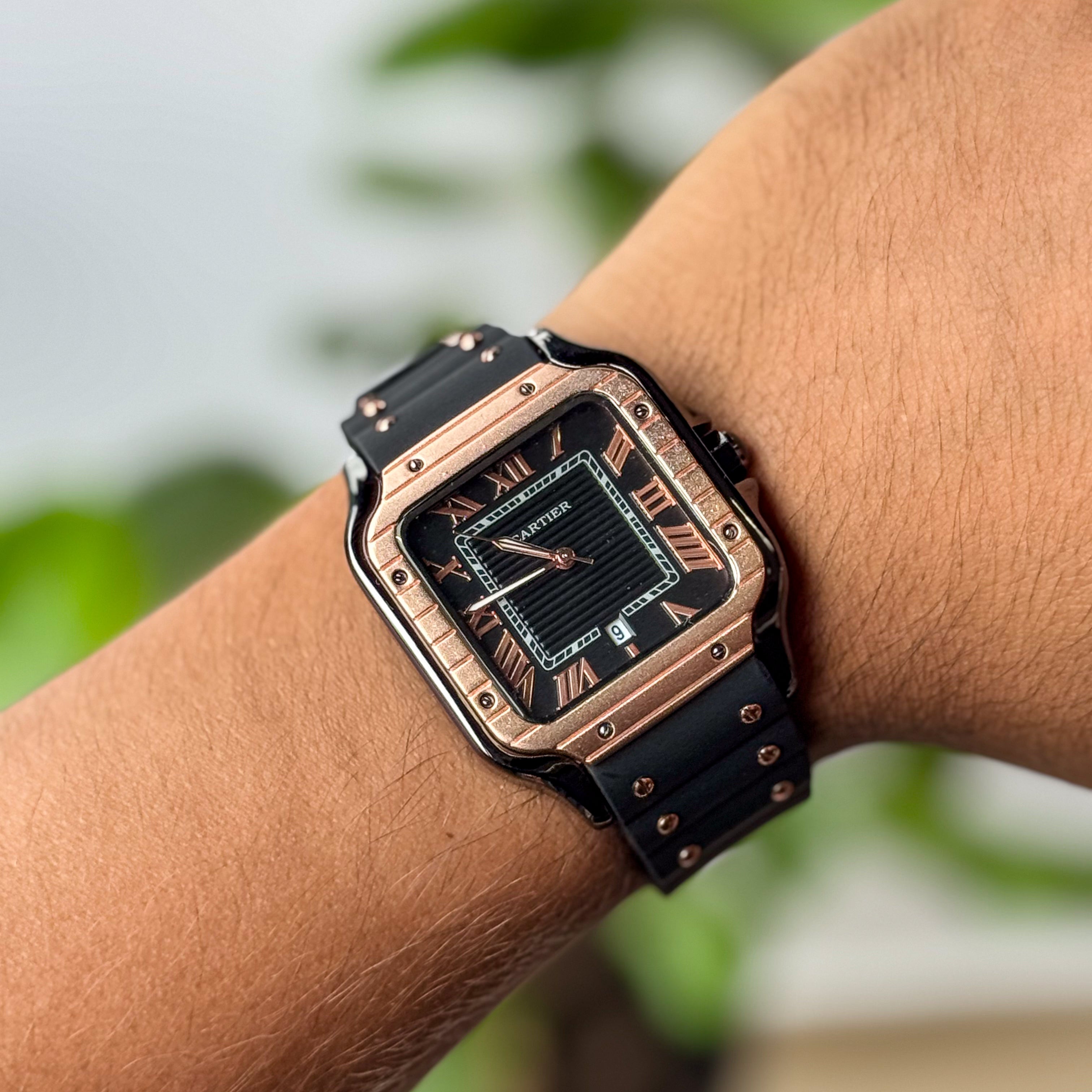 Un reloj imponente y sofisticado que refleja lujo clásico con una presencia fuerte y elegante. Su carátula negra 🖤, con números romanos distintivos, transmite carácter y distinción, mientras que el bisel en tono oro rosa 🌹✨ aporta un brillo cálido y refinado que eleva el diseño.