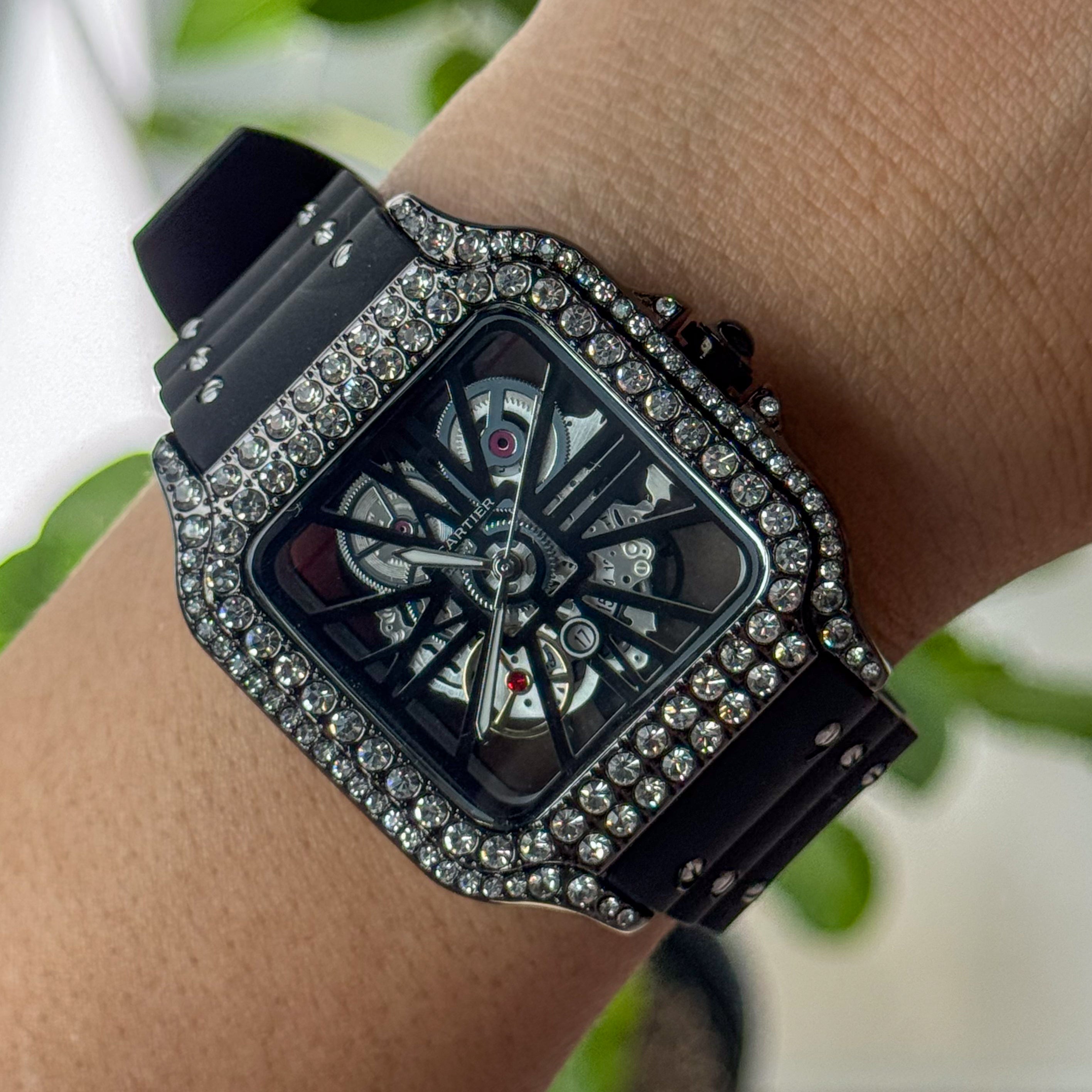 🎨 Color: Carátula esqueletada ⚙️ / Bisel oscuro ⚫ con cristales 💎 / Correa negra 🖤