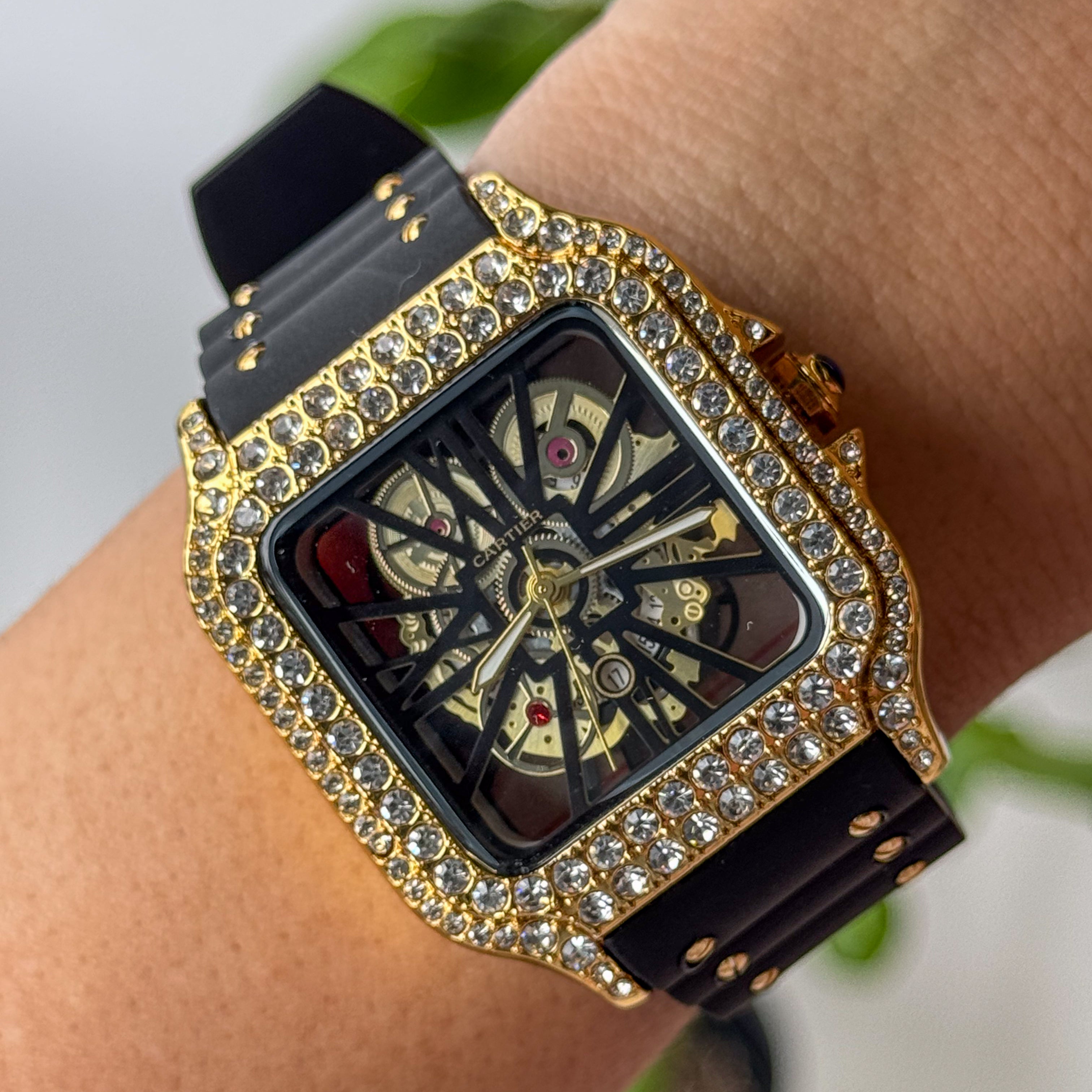 🎨 Color: Carátula negra ⚫ con detalles dorados ✨ / Piedras doradas ✨ / Correa negra 🖤