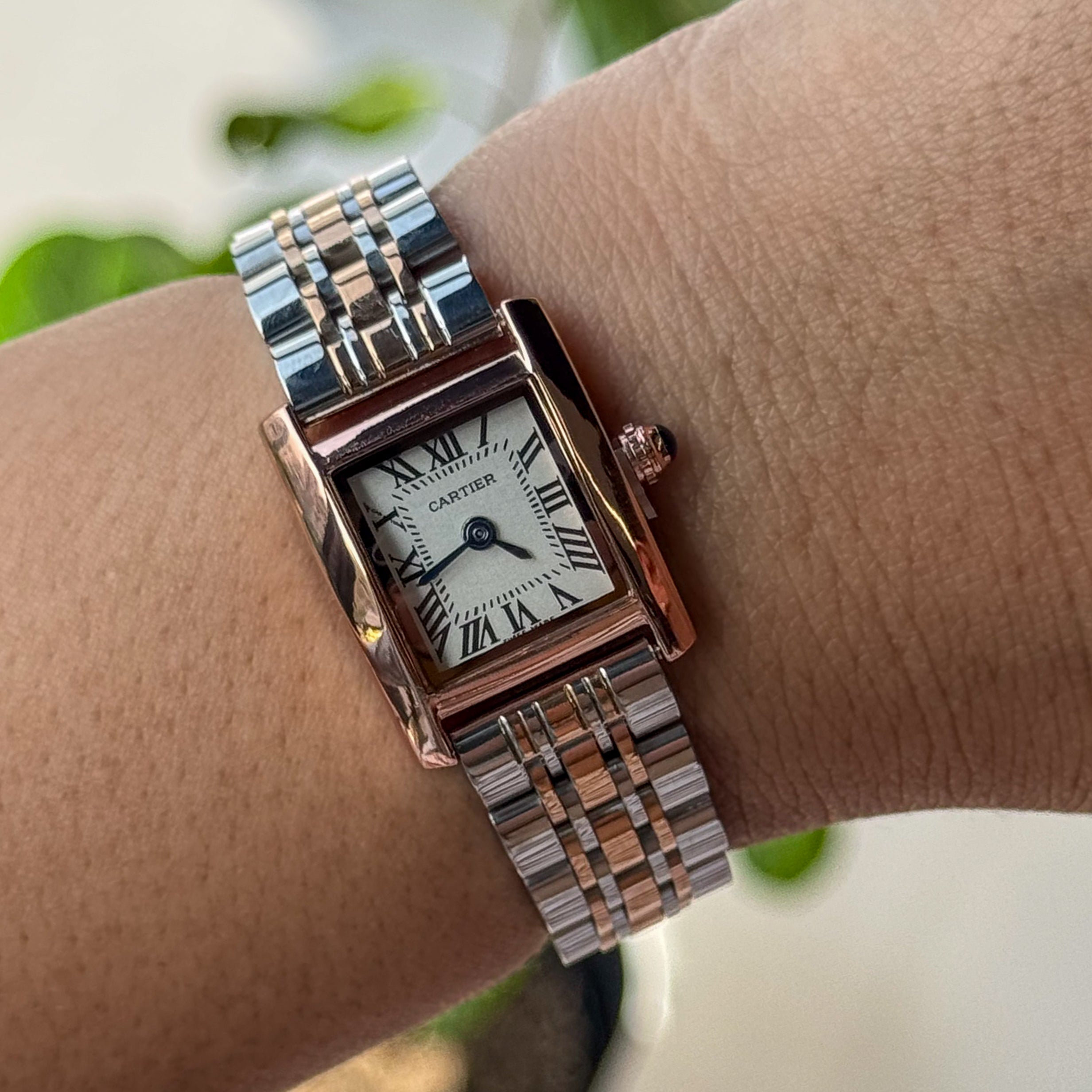 La esfera blanca 🤍 con números romanos negros crea un contraste refinado que resalta la legibilidad y el estilo emblemático de Cartier.