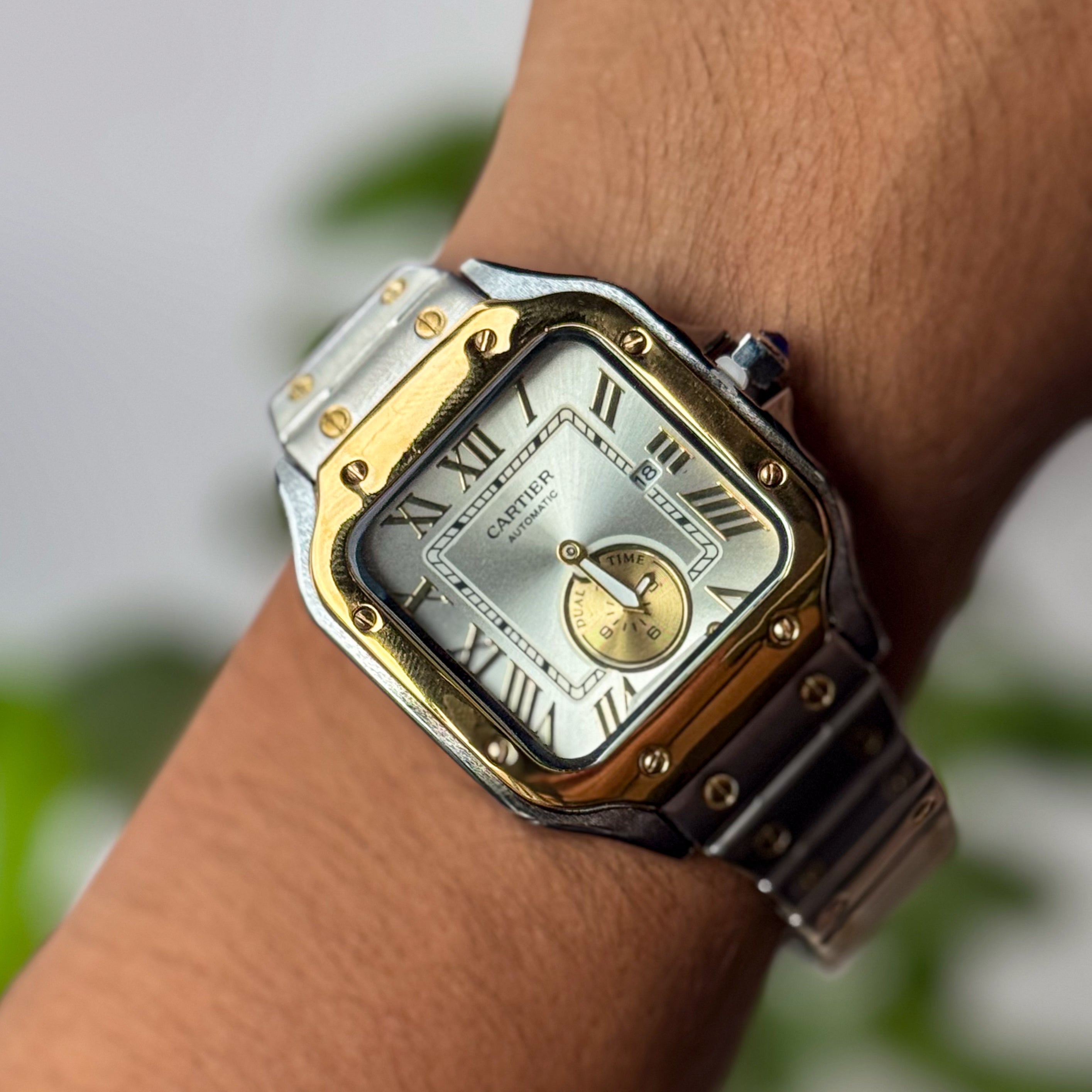 Un reloj que combina perfectamente la elegancia clásica con un estilo contemporáneo y masculino. Su caja cuadrada y brazalete bicolor en acero plateado y detalles dorados 👑✨, realzados con tornillos visibles, transmiten lujo, sofisticación y una presencia imponente.