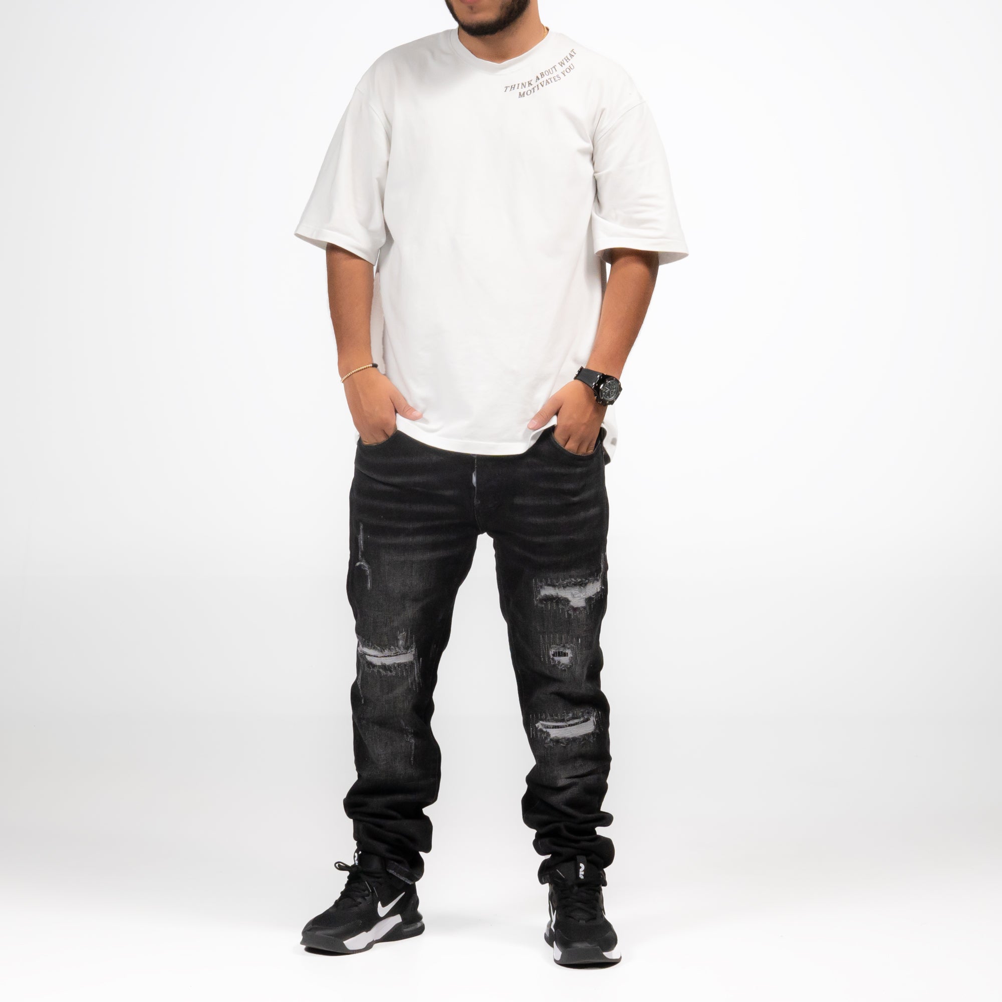 Jeans negro de corte recto con efecto desgastado y rasgados en las piernas, que transmiten una estética rebelde y moderna. Su diseño combina textura, contraste y actitud, inspirado en el estilo urbano característico de Dsquared2.
