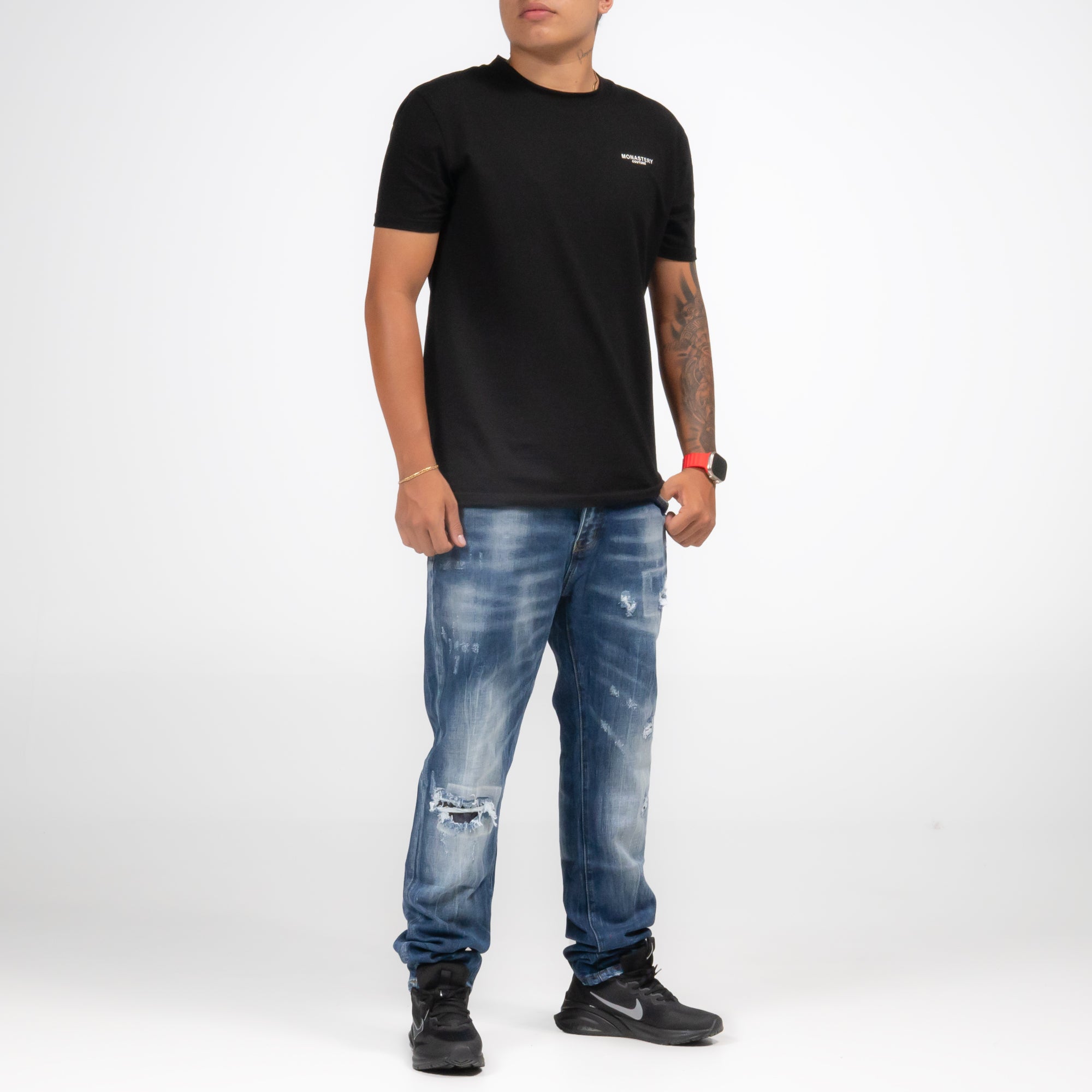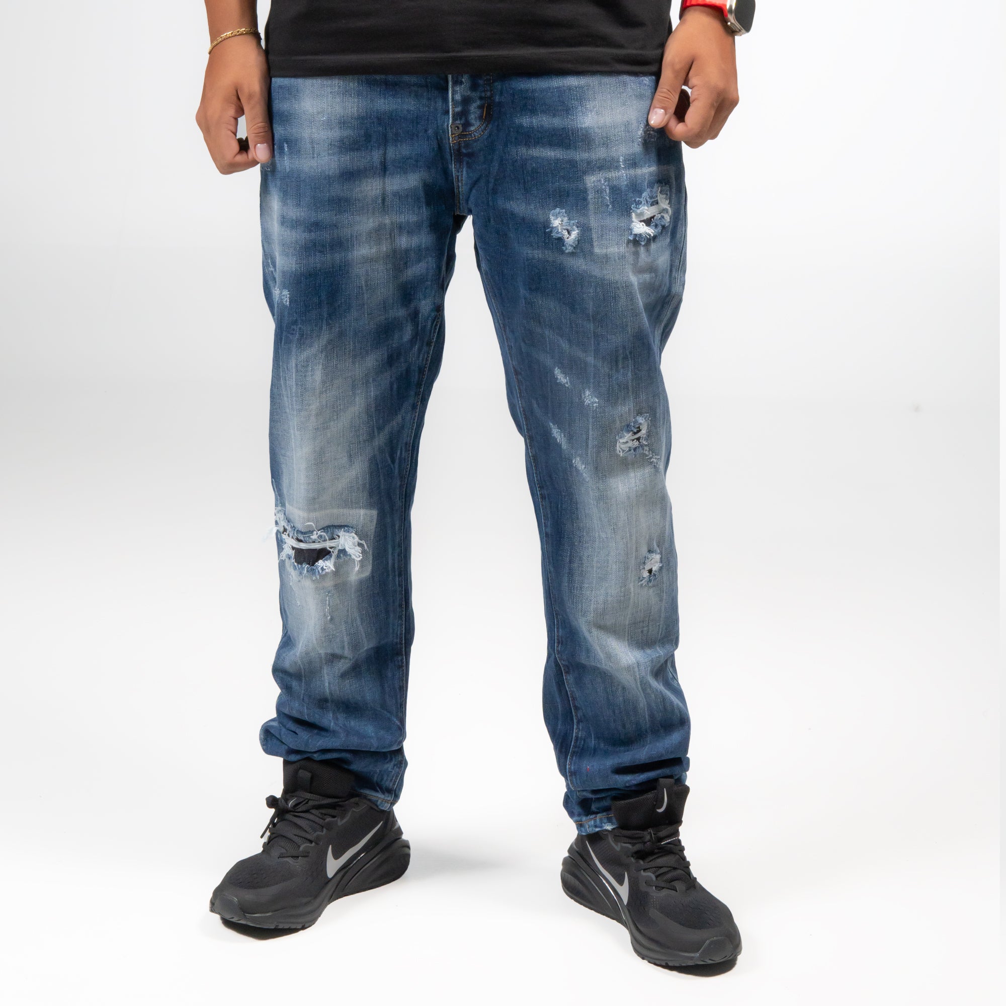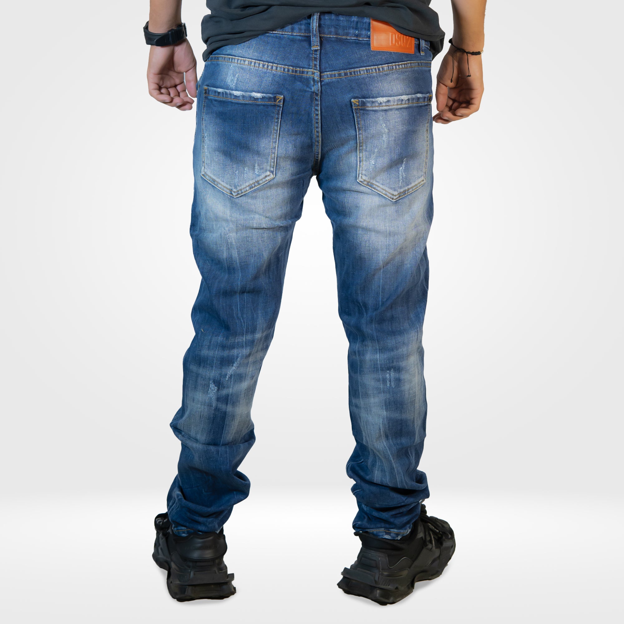 Jeans de corte recto en tono azul medio 🔵, con lavado marcado y rasgados visibles que aportan un estilo moderno y urbano 👌. Presenta zonas desgastadas en el frente y roturas estratégicas para un look street con carácter. Incorpora parche trasero con logo al estilo Dsquared2 🏷️.