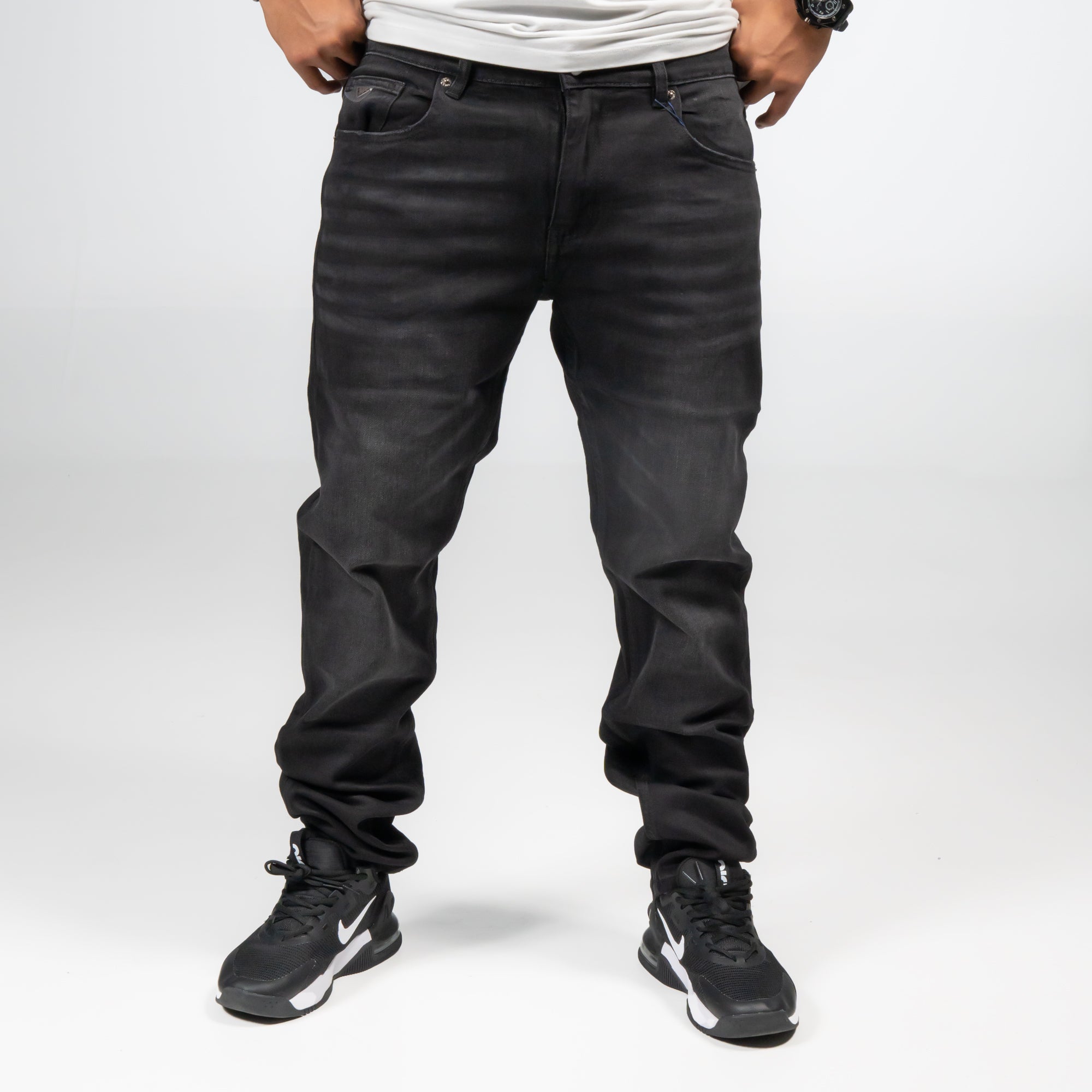 Jeans en color negro lavado, con un acabado suave que aporta un estilo urbano y actual. Su diseño limpio, sin roturas y con un tono degradado sutil, transmite elegancia discreta y un aire moderno.