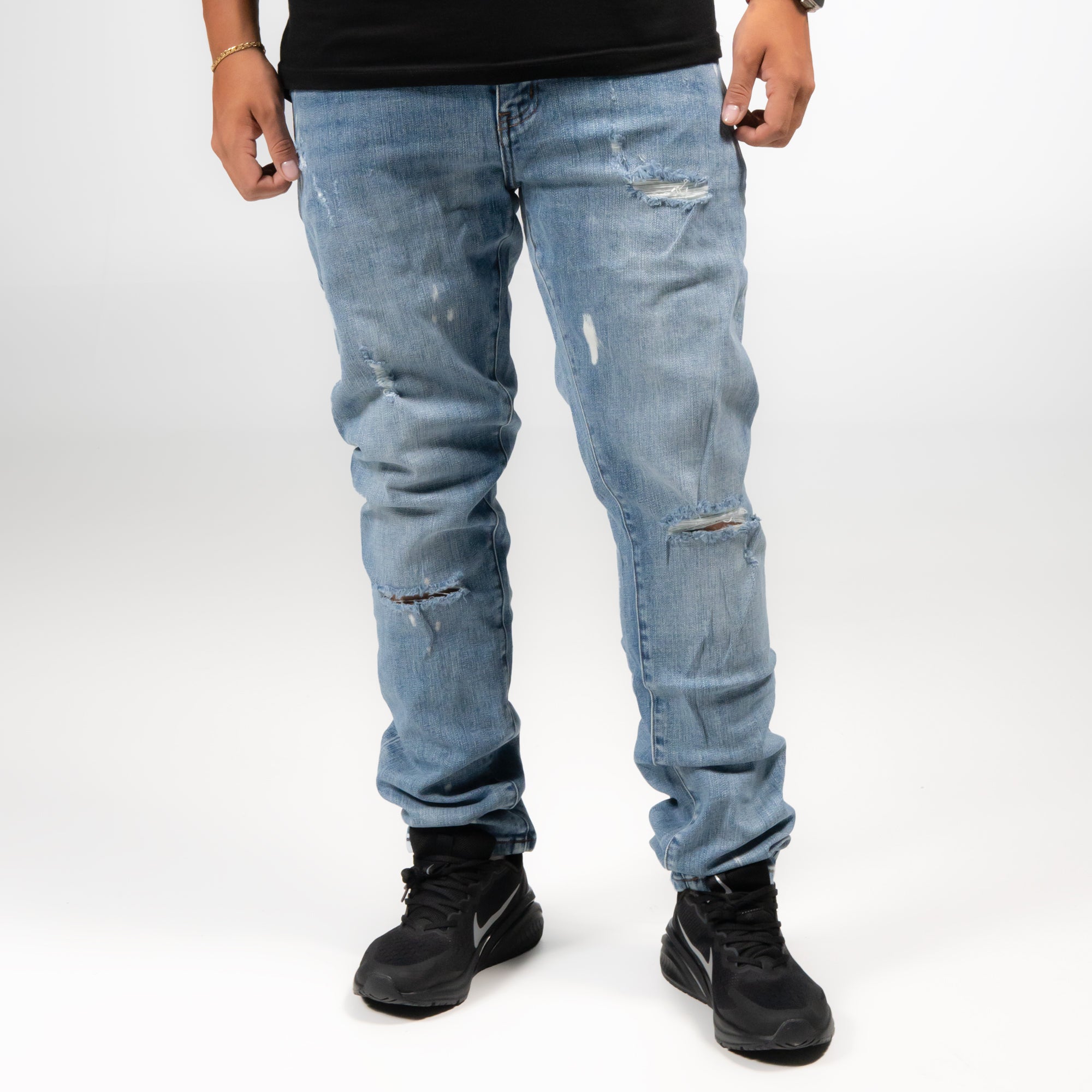 Jeans de corte Slim en mezclilla azul claro con un desgaste más suave y claro que aporta un look desgastado natural. Presenta un roto mediano en un muslo y varios rotos pequeños con fondo blanco, que aportan contraste y estilo urbano sin perder frescura.