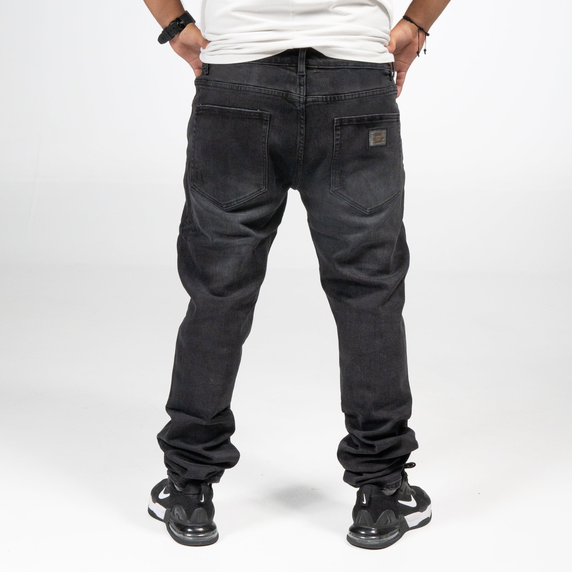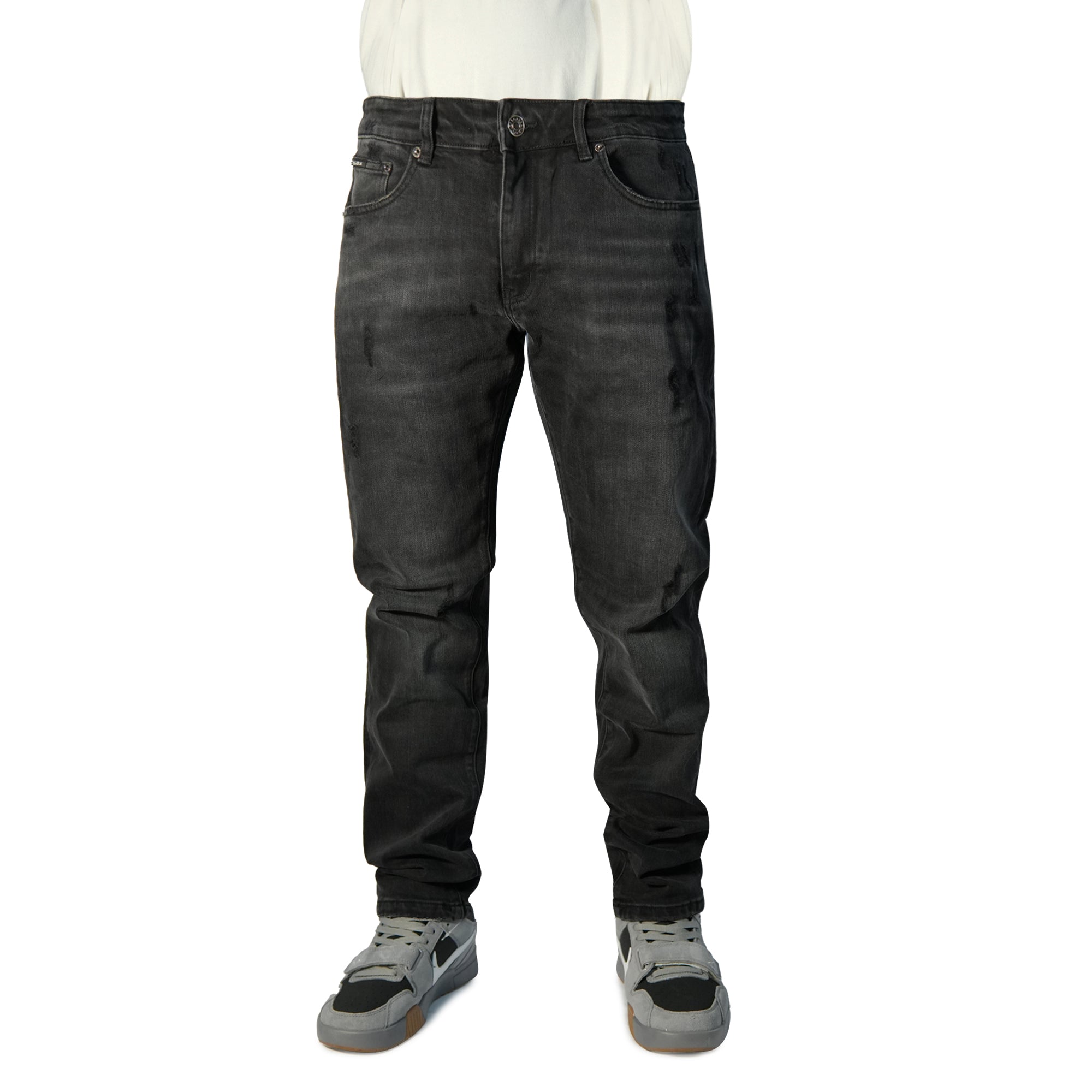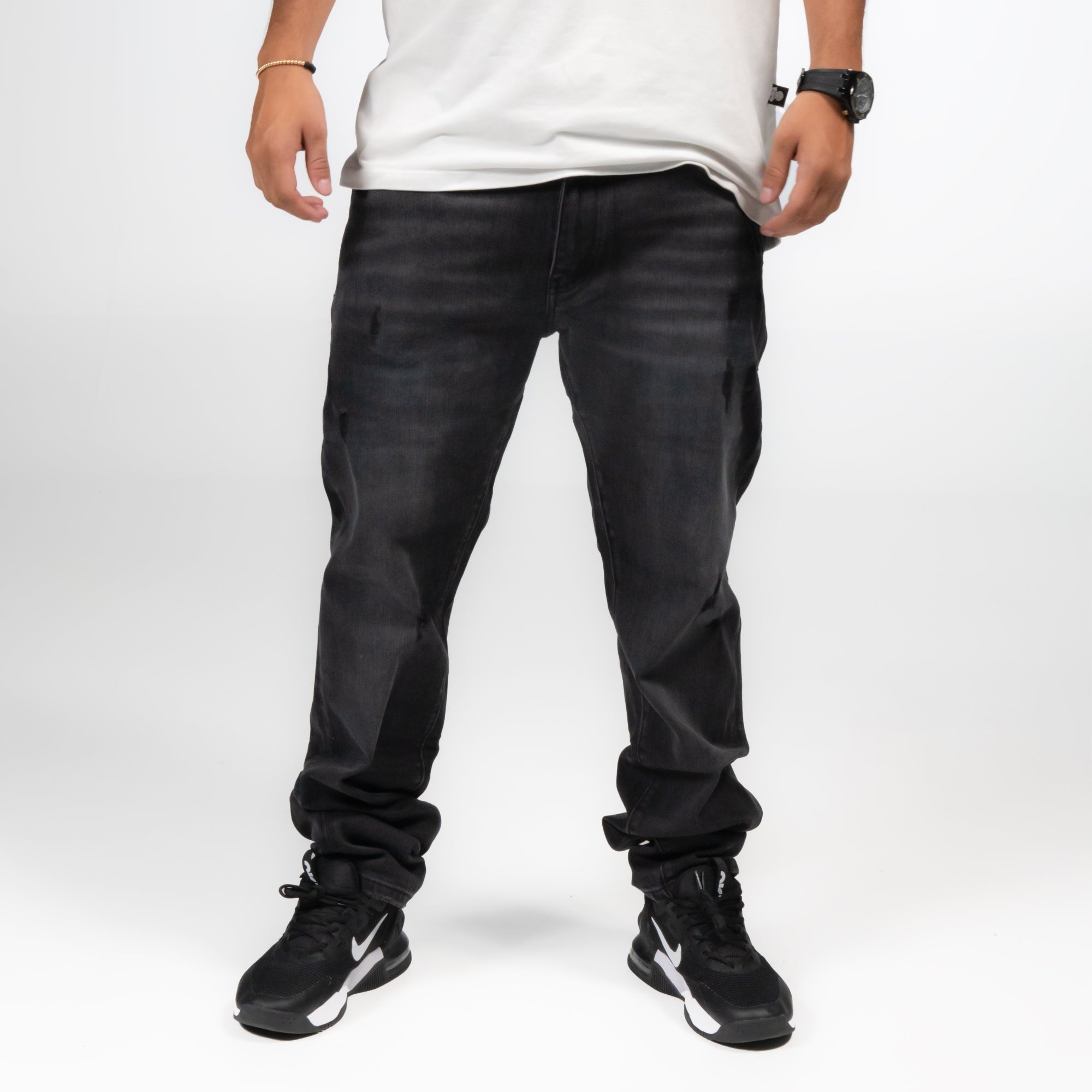 Jeans slim en mezclilla gris oscuro con acabado casi negro, confeccionados con tejido estructurado y tacto suave. Presentan pequeños rotos negros en los laterales, sutiles y estratégicamente ubicados para añadir textura sin romper la sobriedad del diseño.