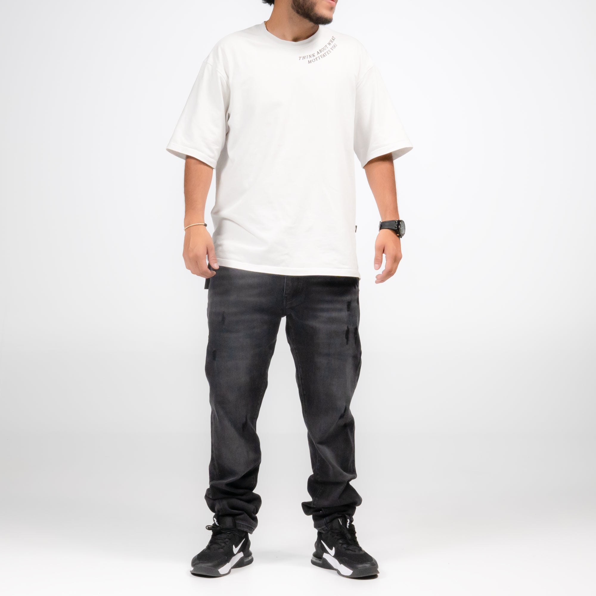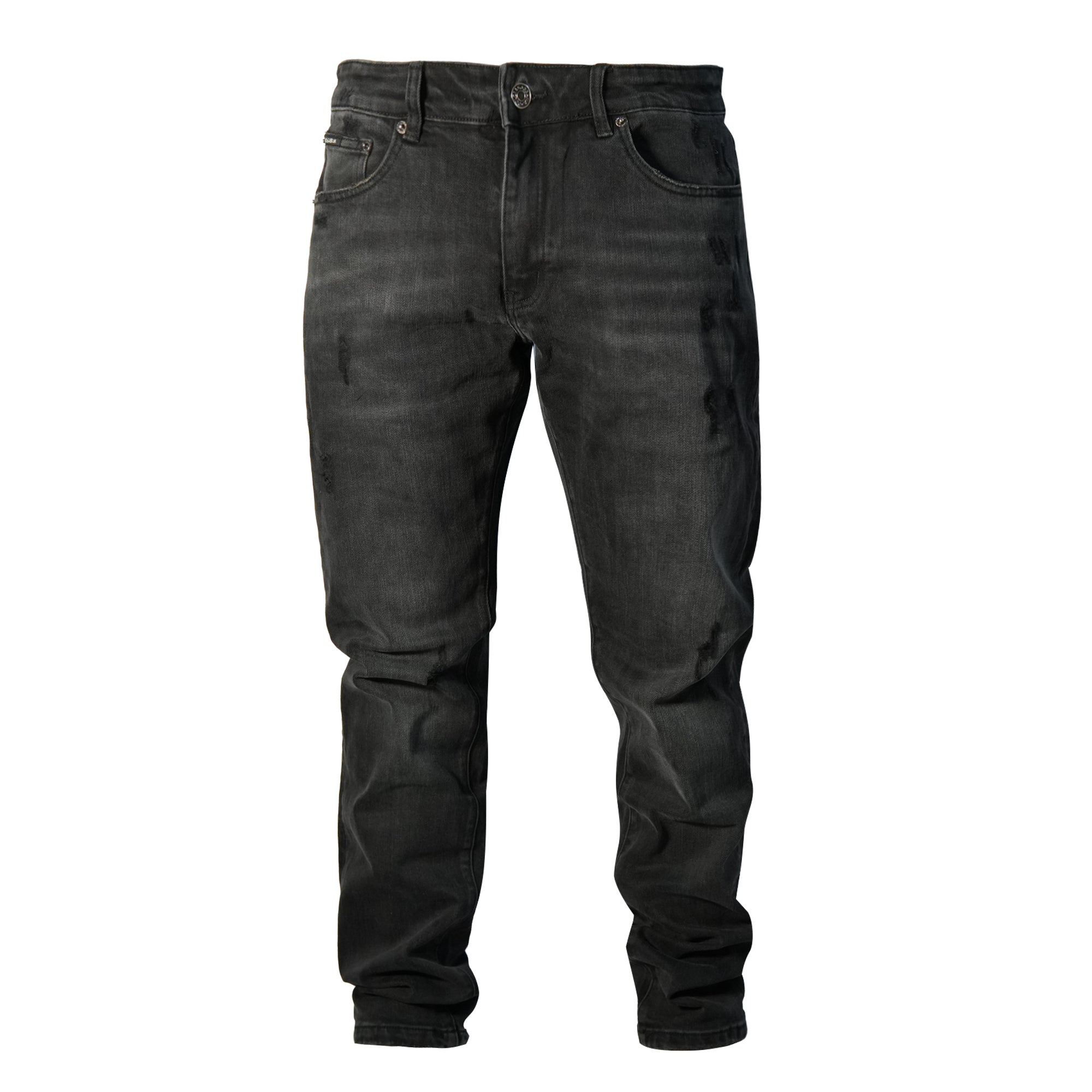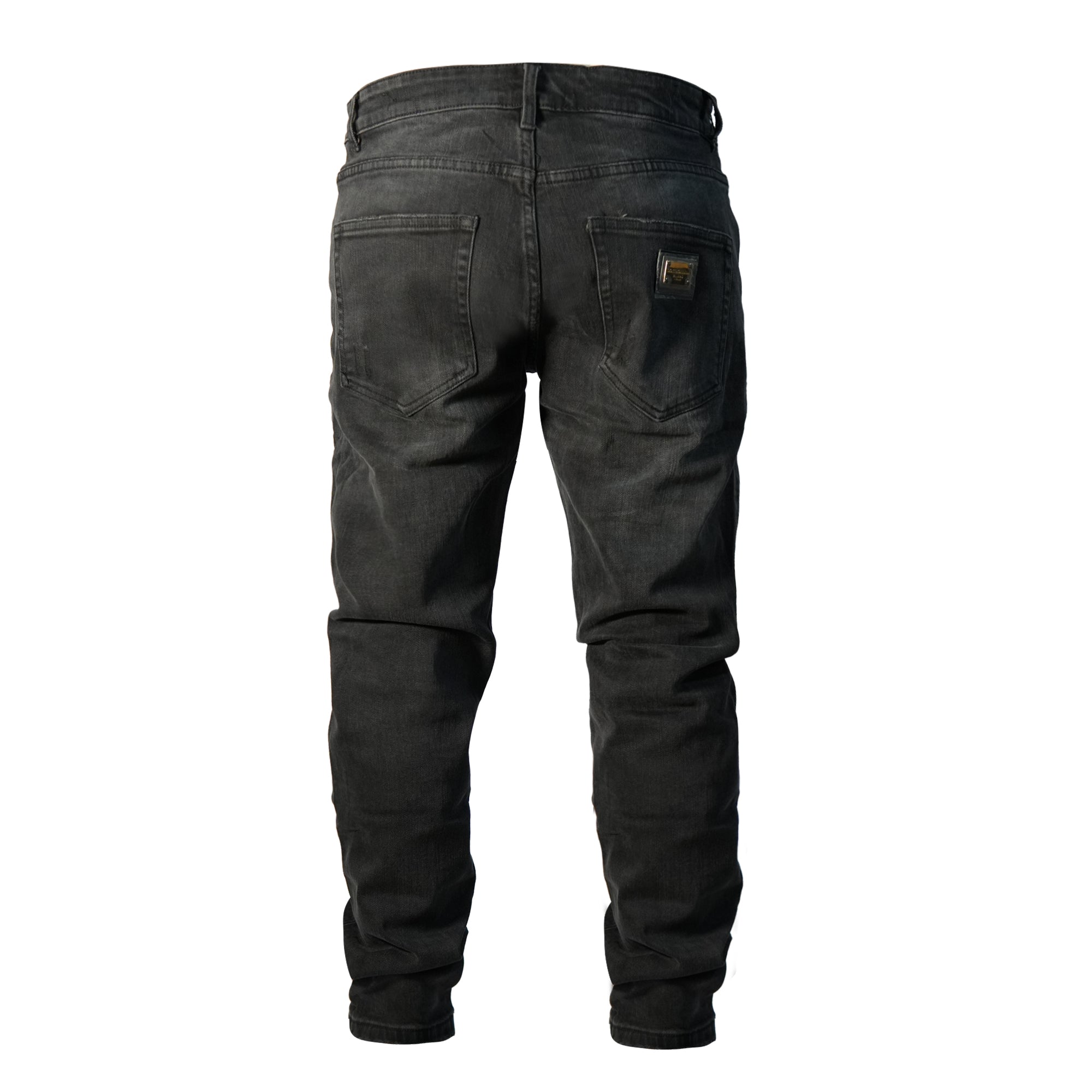 Jeans slim en mezclilla gris oscuro con acabado casi negro, confeccionados con tejido estructurado y tacto suave. Presentan pequeños rotos negros en los laterales, sutiles y estratégicamente ubicados para añadir textura sin romper la sobriedad del diseño.