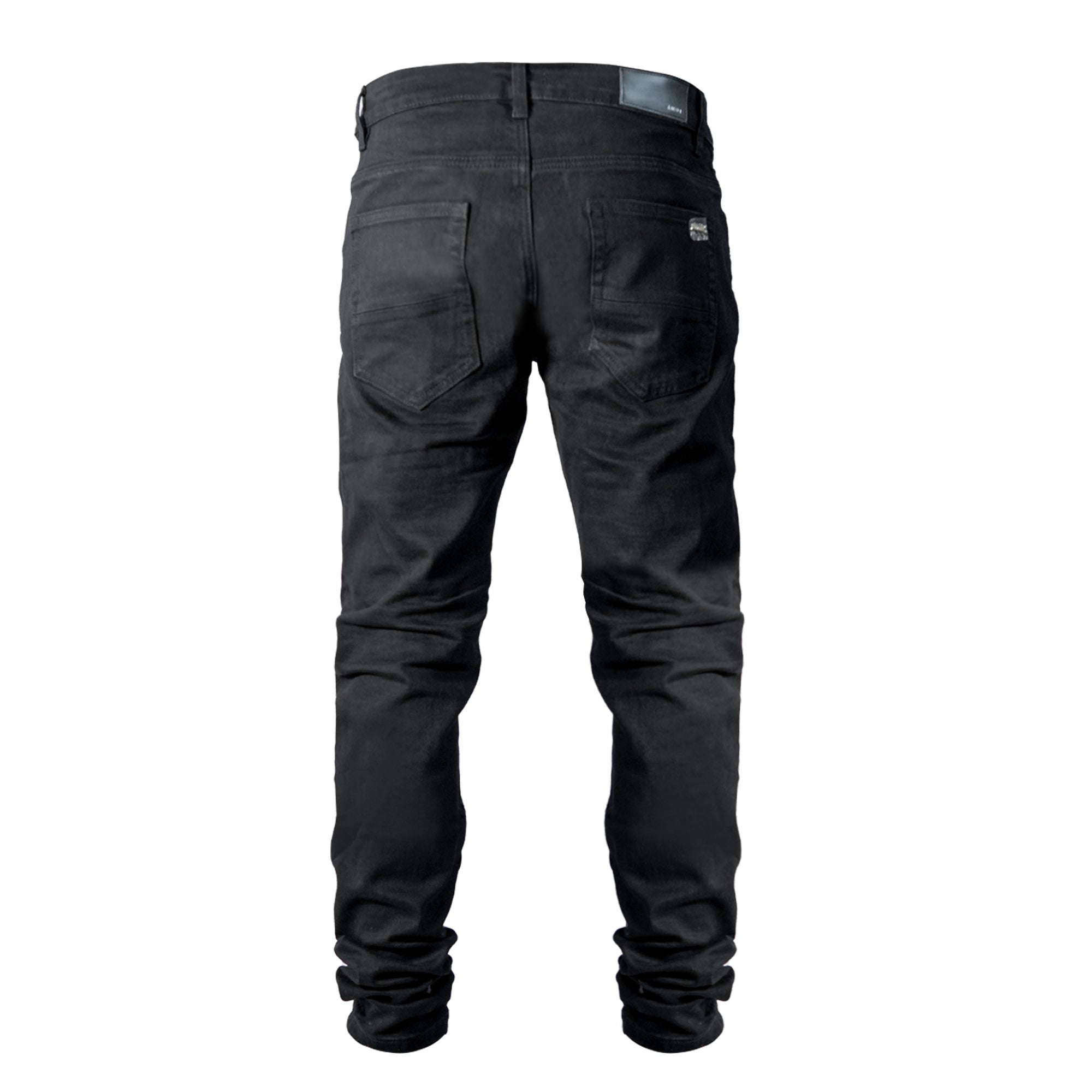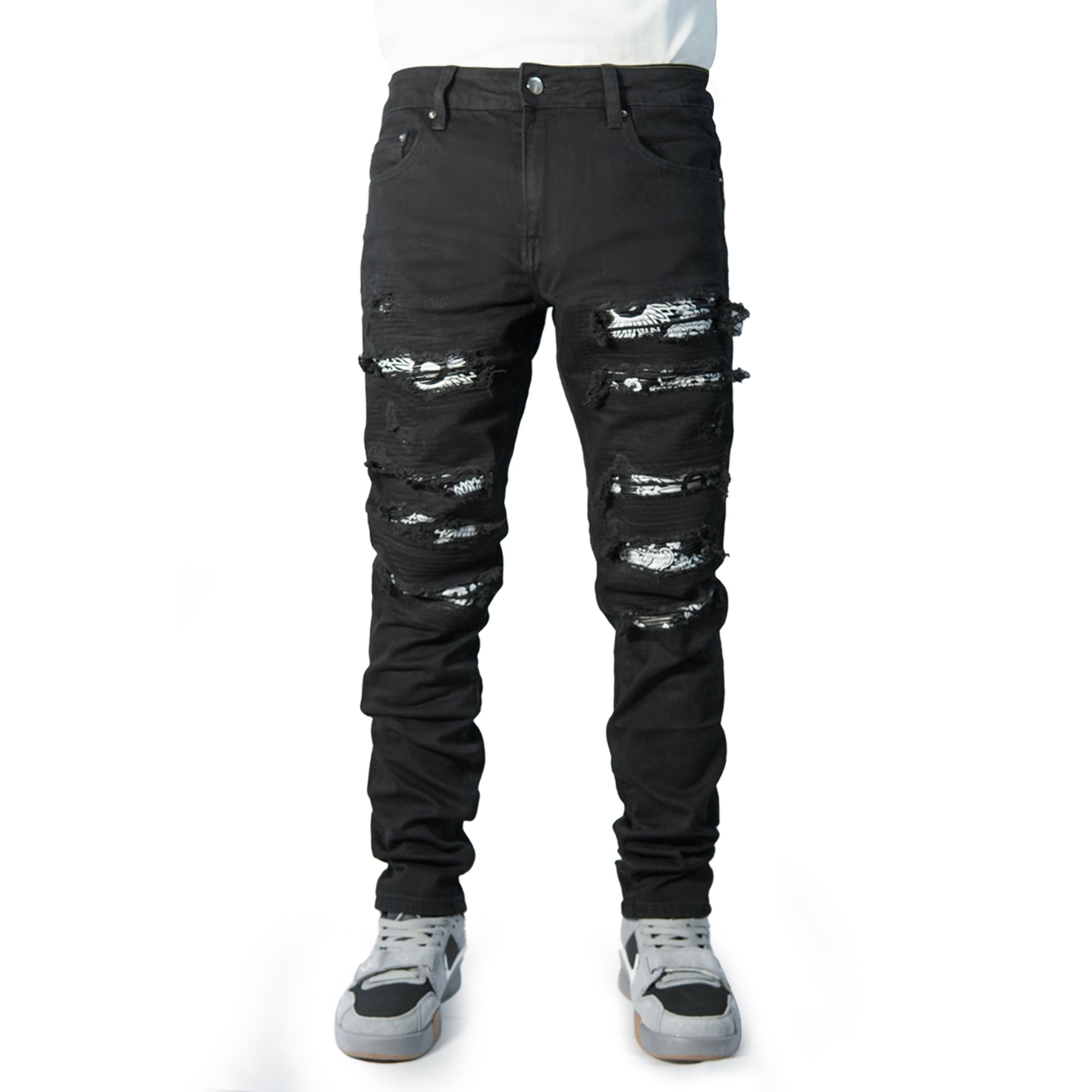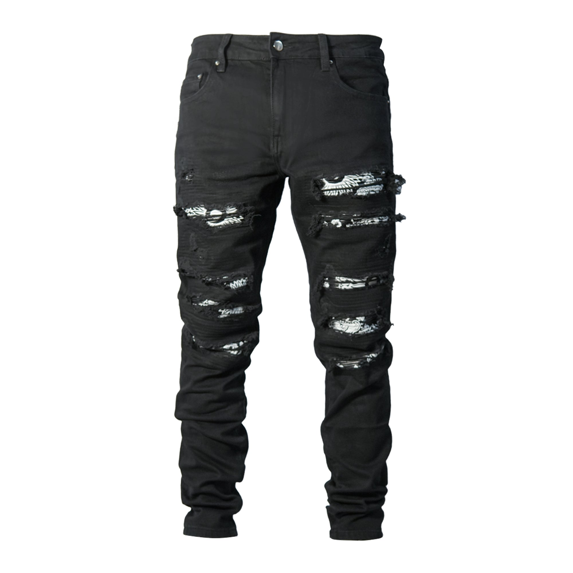 Jeans de corte slim confeccionados en mezclilla negra total, sin desgastes ni lavados. Incorporan roturas marcadas en rodillas y muslos que revelan un forro blanco con detalles en negro, generando un contraste visual fuerte y distintivo. Una prenda con actitud, ideal para un estilo urbano con carácter definido.
