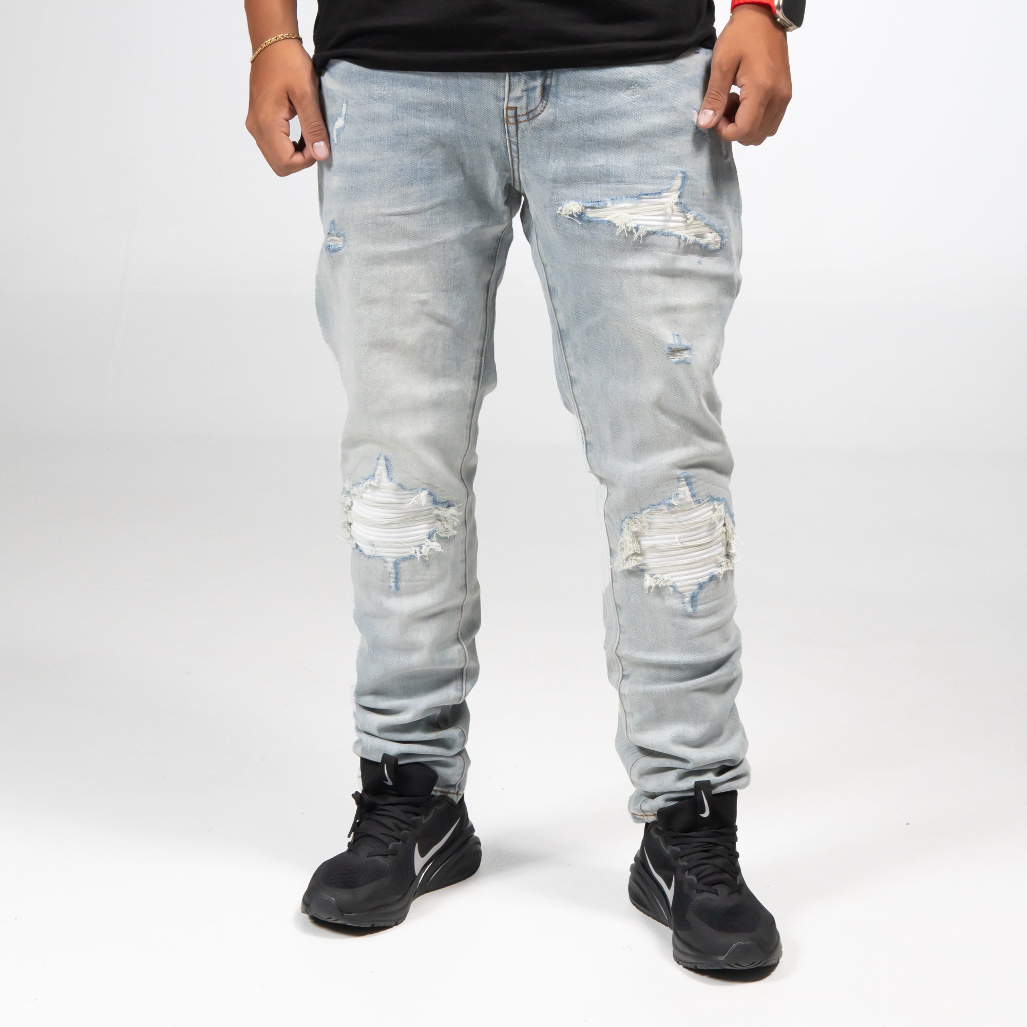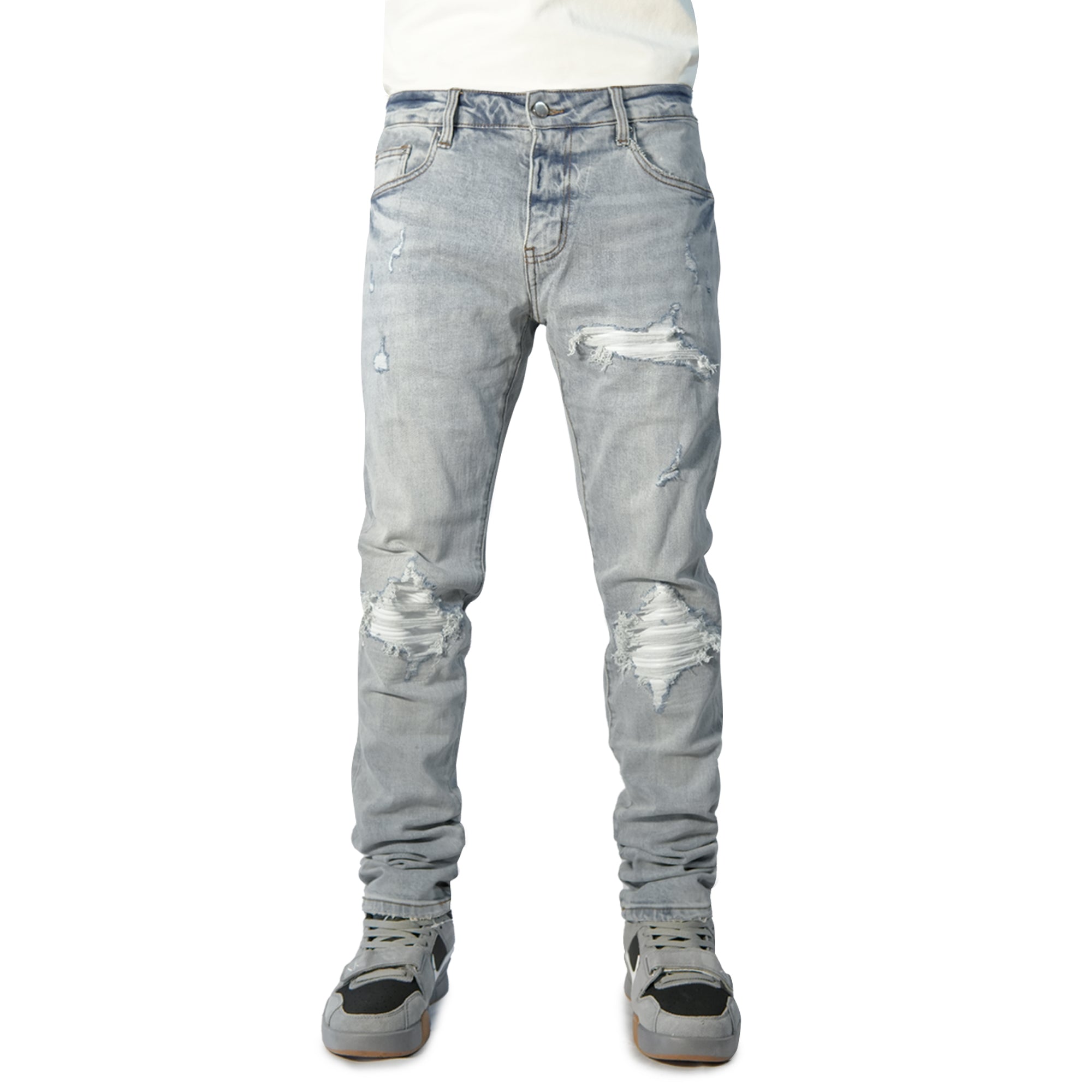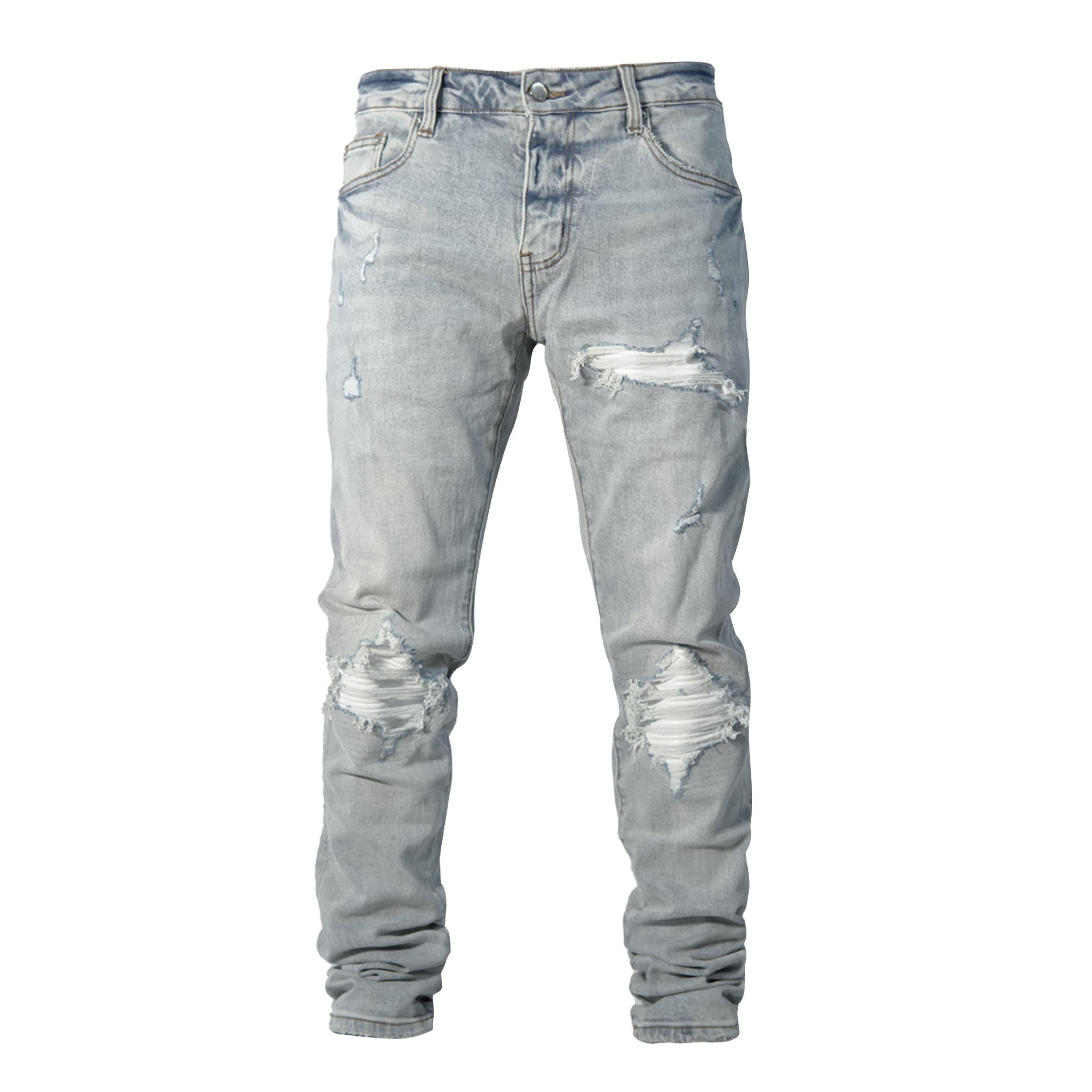 Jeans de corte slim en mezclilla azul muy claro con un tono sutilmente grisáceo. Presenta un lavado suave con desgaste pronunciado en las rodillas, donde las roturas están reforzadas con un forro interior blanco que genera contraste visual. El acabado artesanal y el estilo urbano los convierten en una prenda versátil y con actitud.