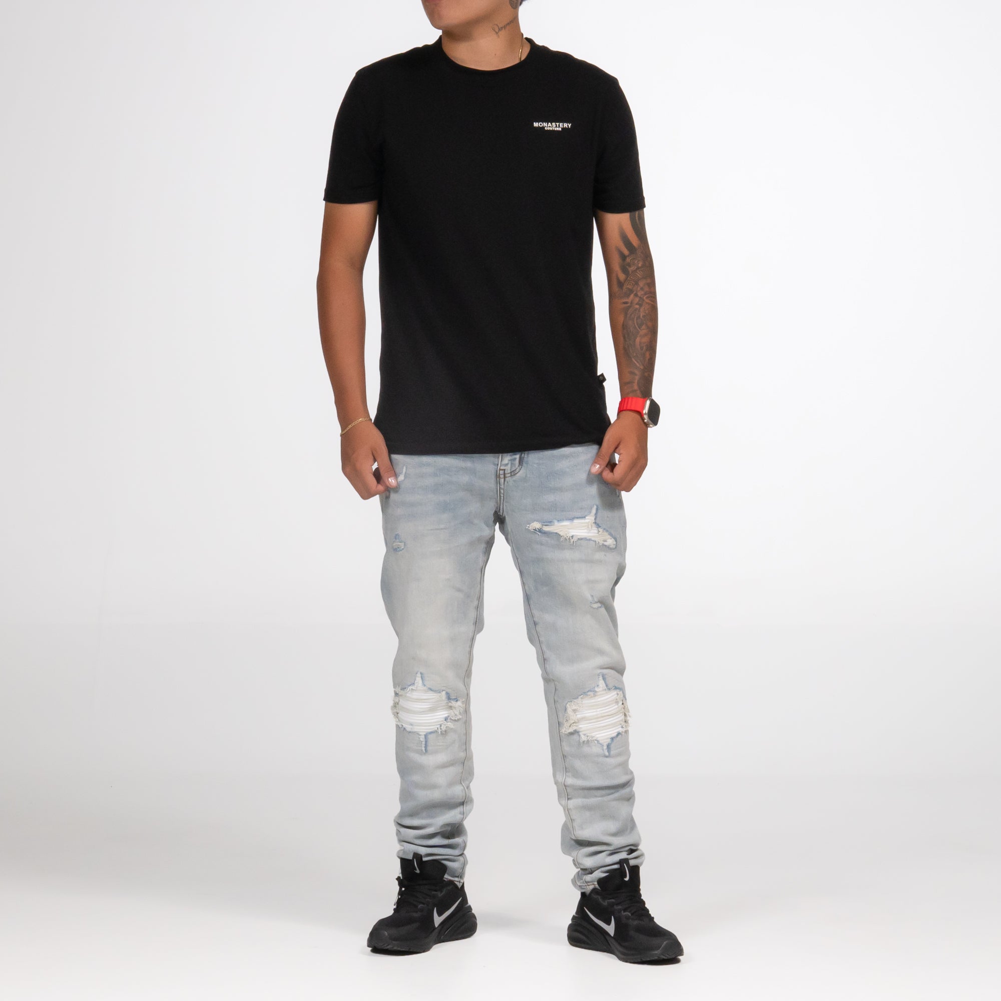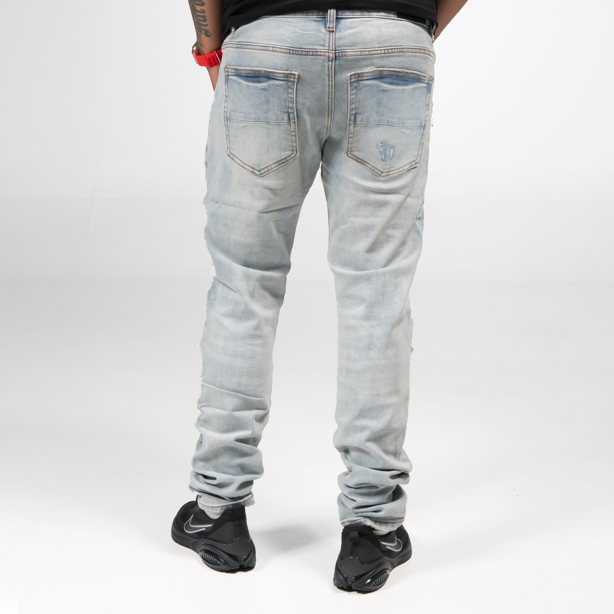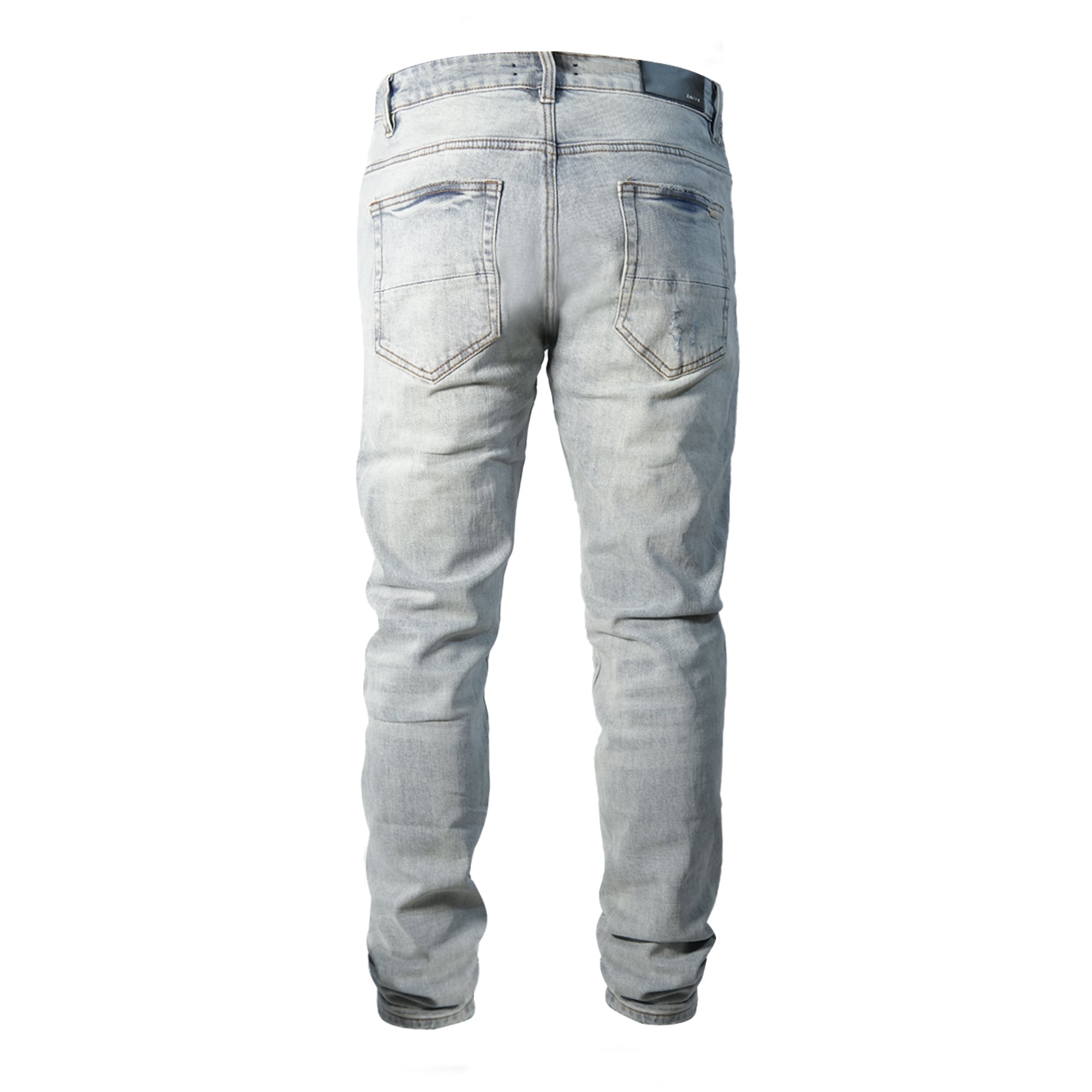 Jeans de corte slim en mezclilla azul muy claro con un tono sutilmente grisáceo. Presenta un lavado suave con desgaste pronunciado en las rodillas, donde las roturas están reforzadas con un forro interior blanco que genera contraste visual. El acabado artesanal y el estilo urbano los convierten en una prenda versátil y con actitud.