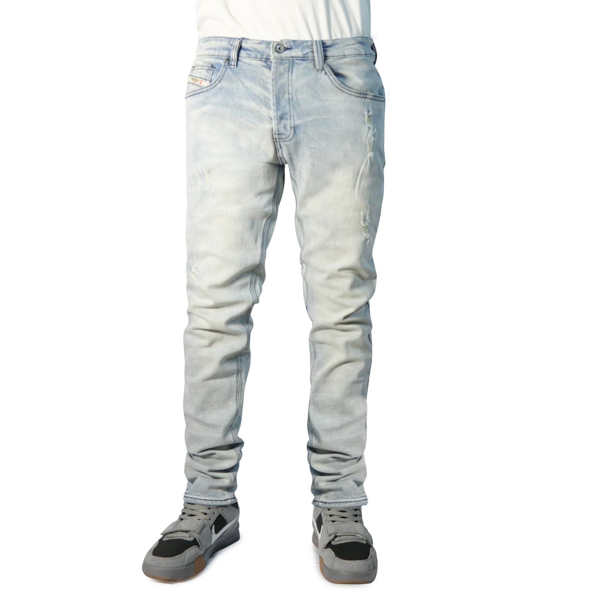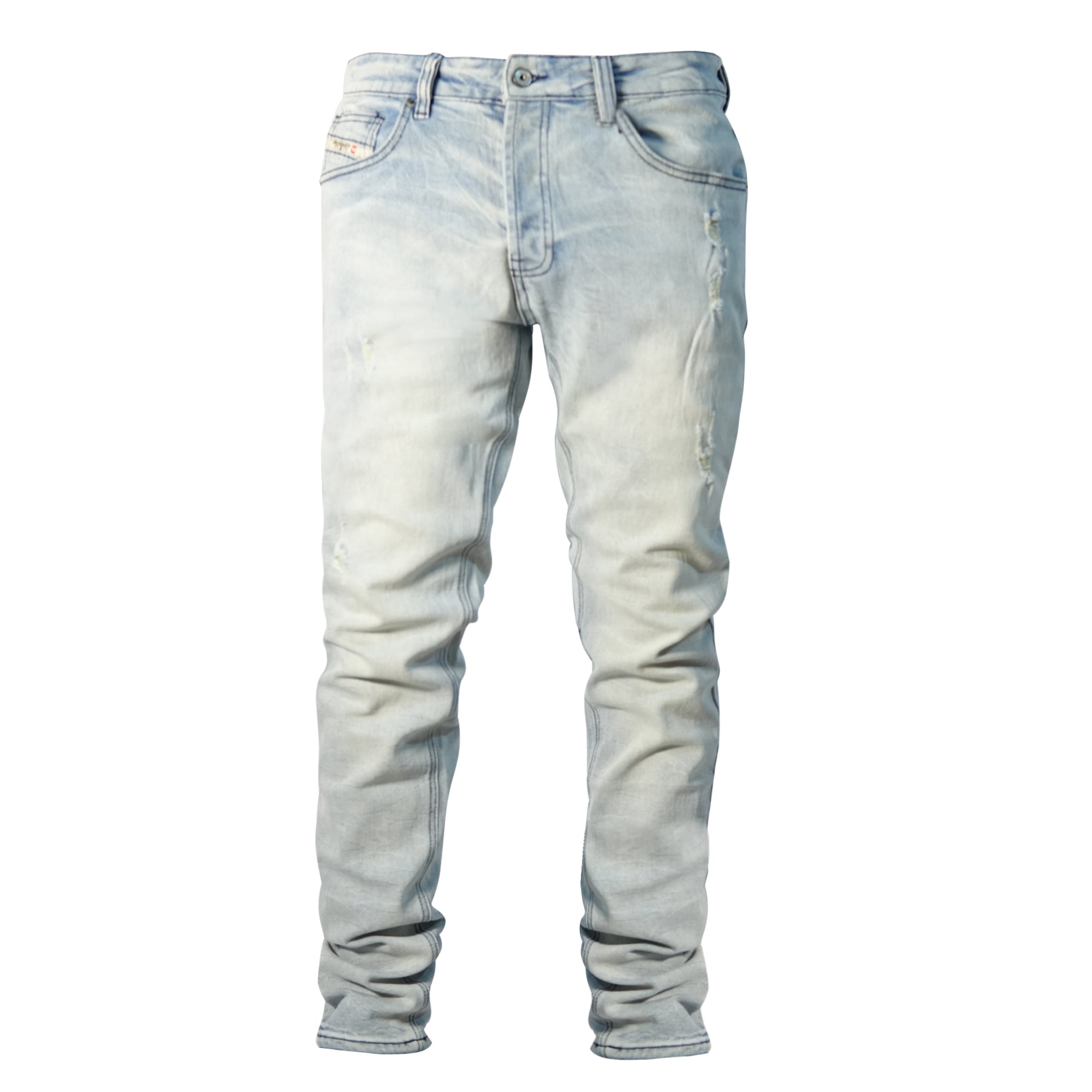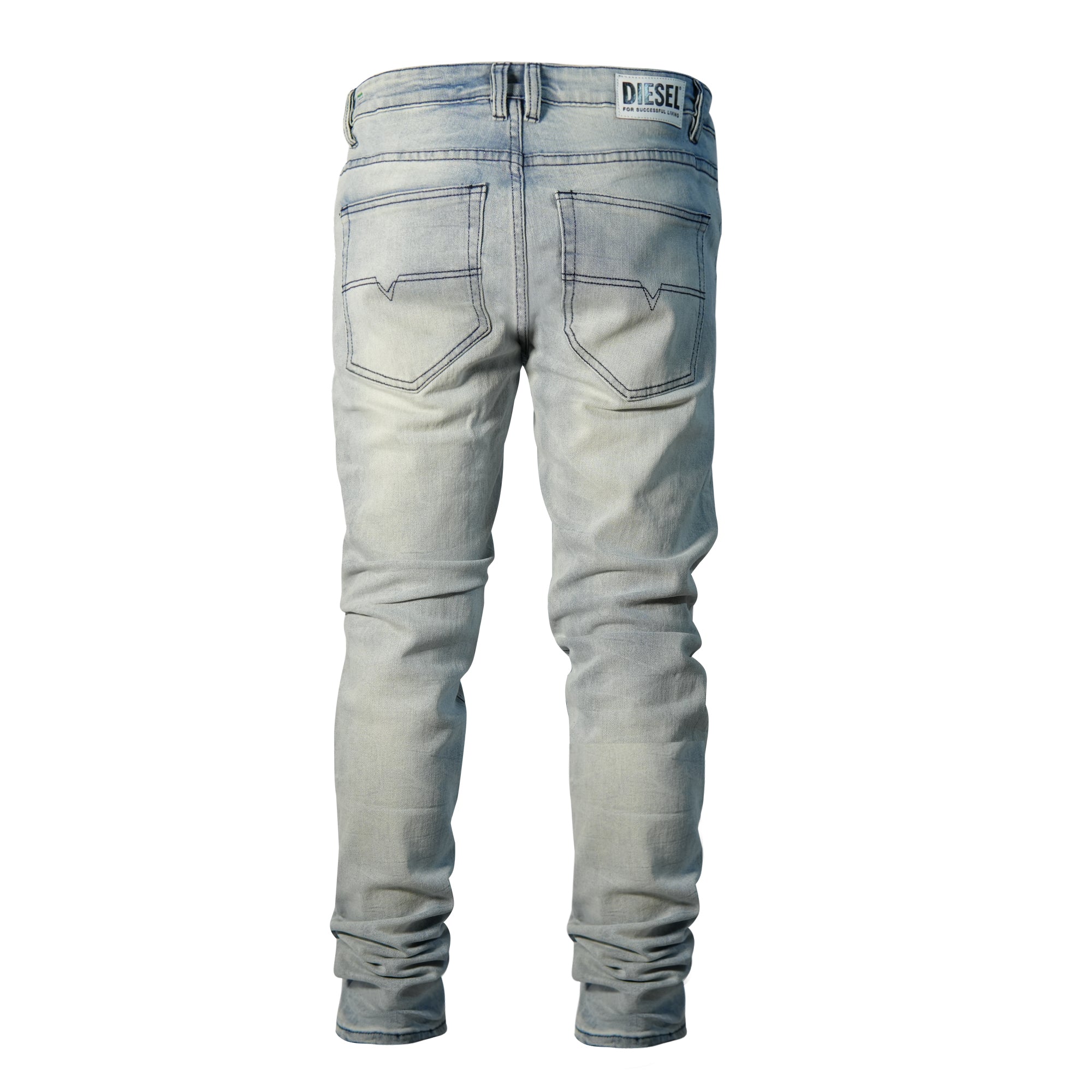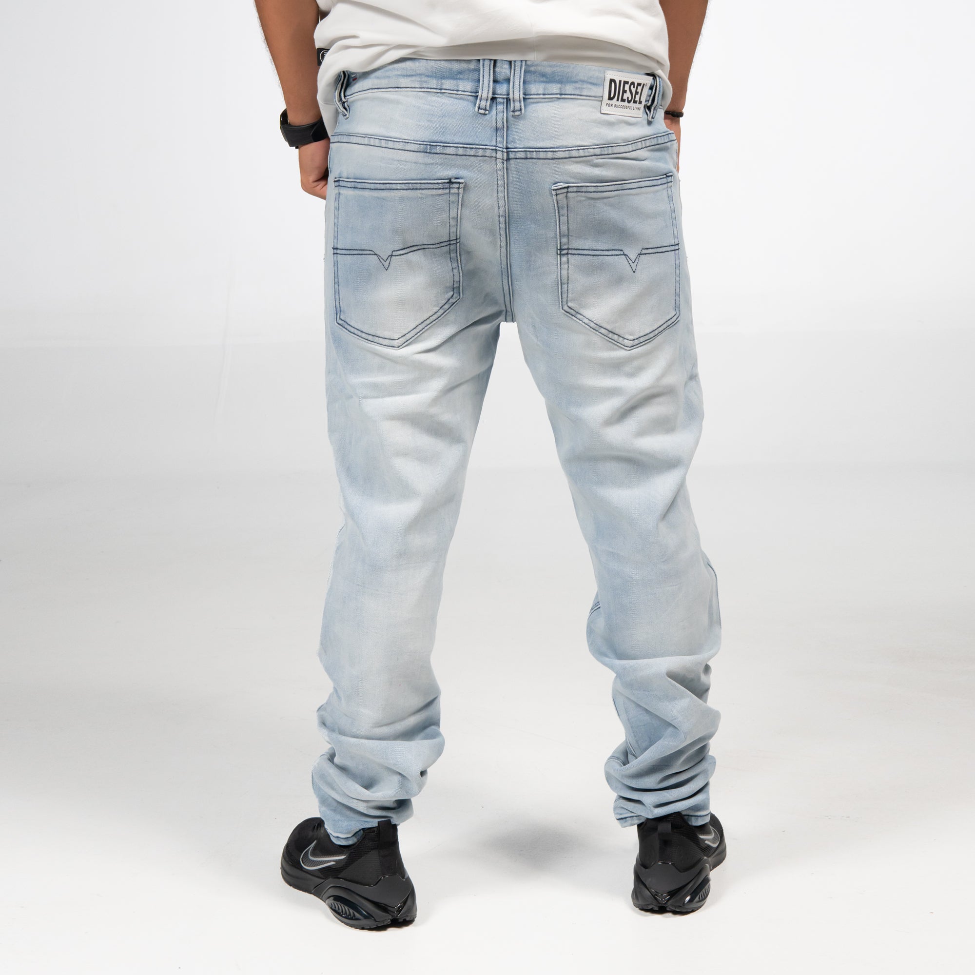 Jeans de corte entallado en azul muy claro con desgaste visible tipo blanqueado. Estilo urbano y atrevido, con contraste marcado en zonas clave. Diseño distintivo de D1ESEL.