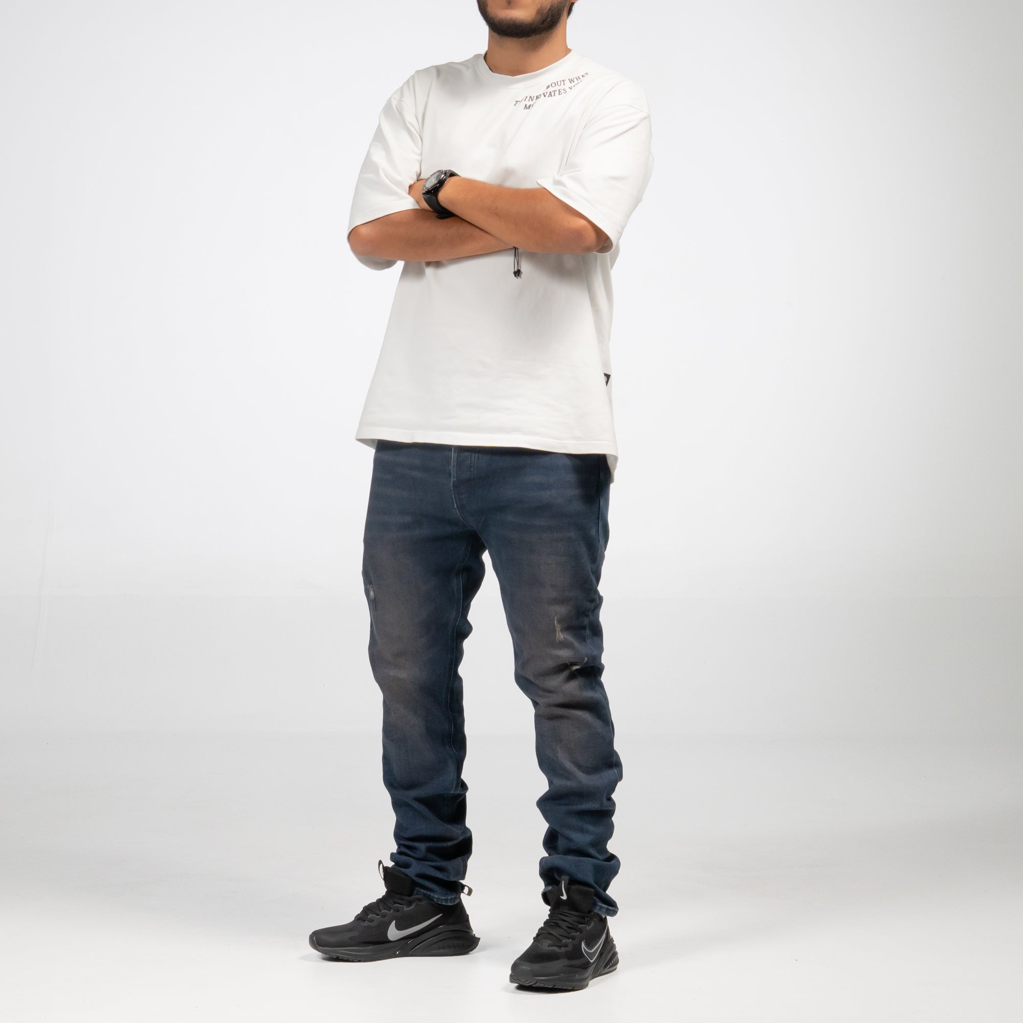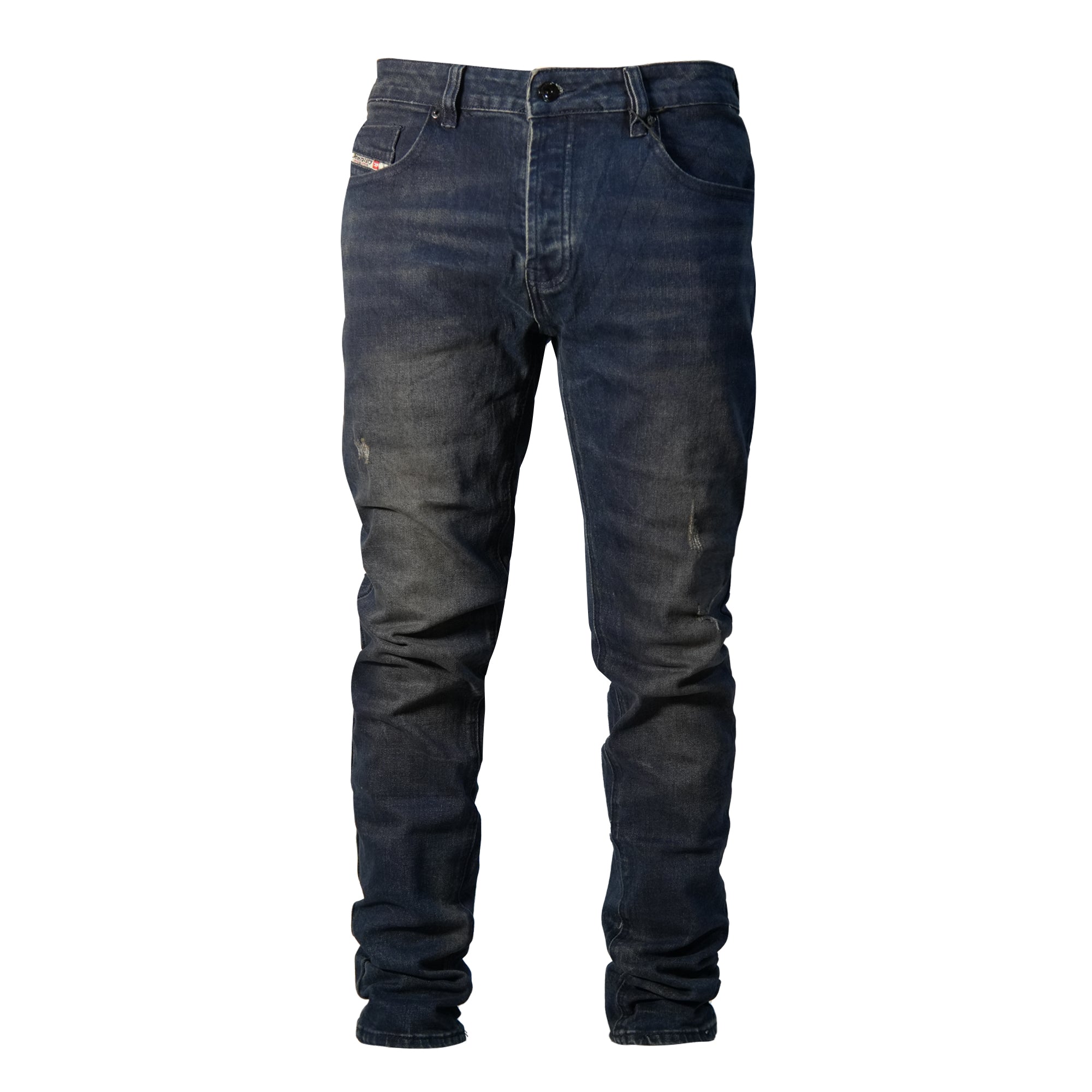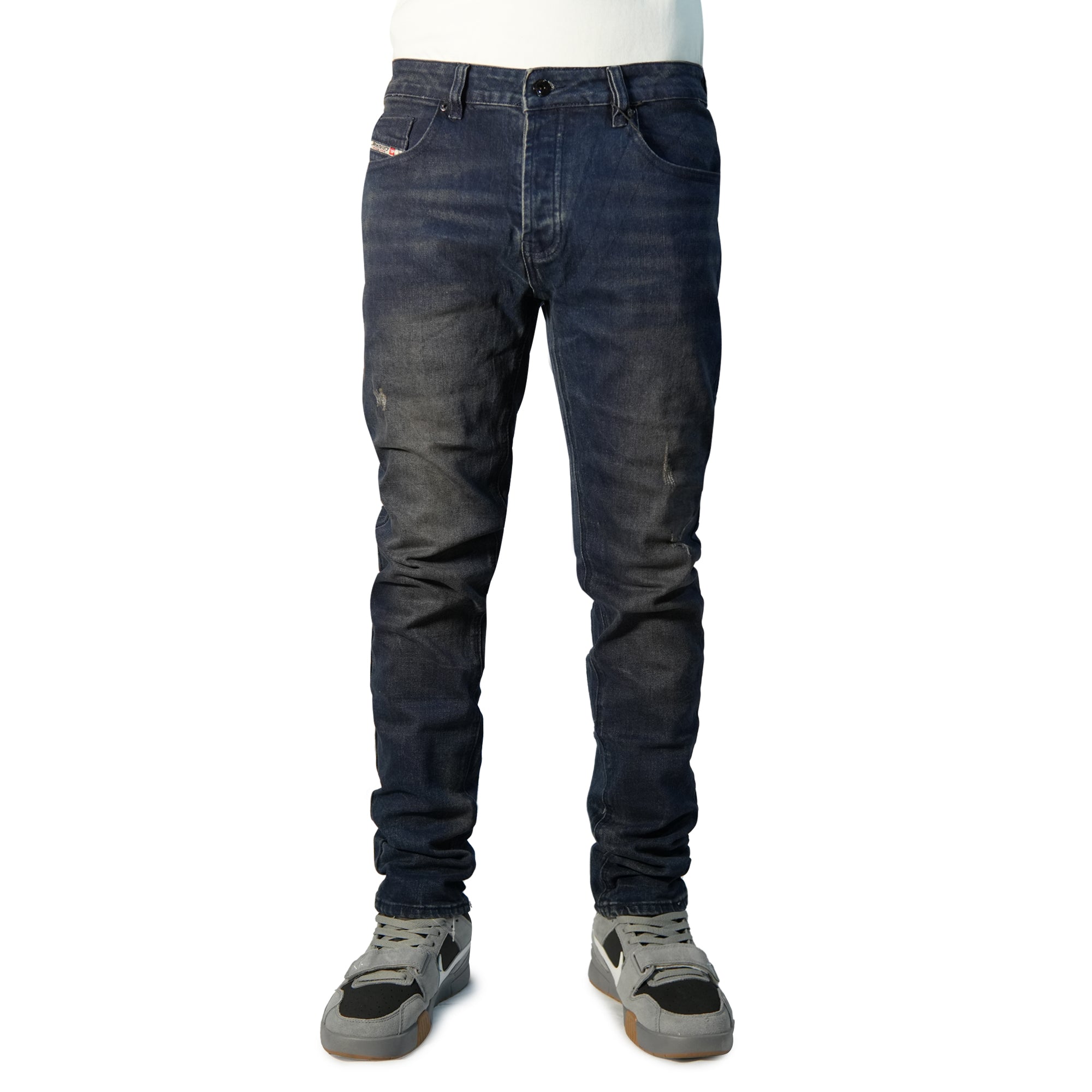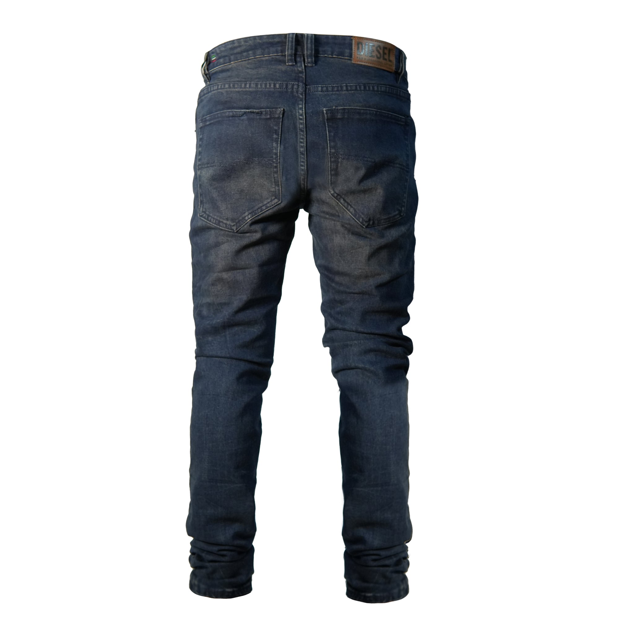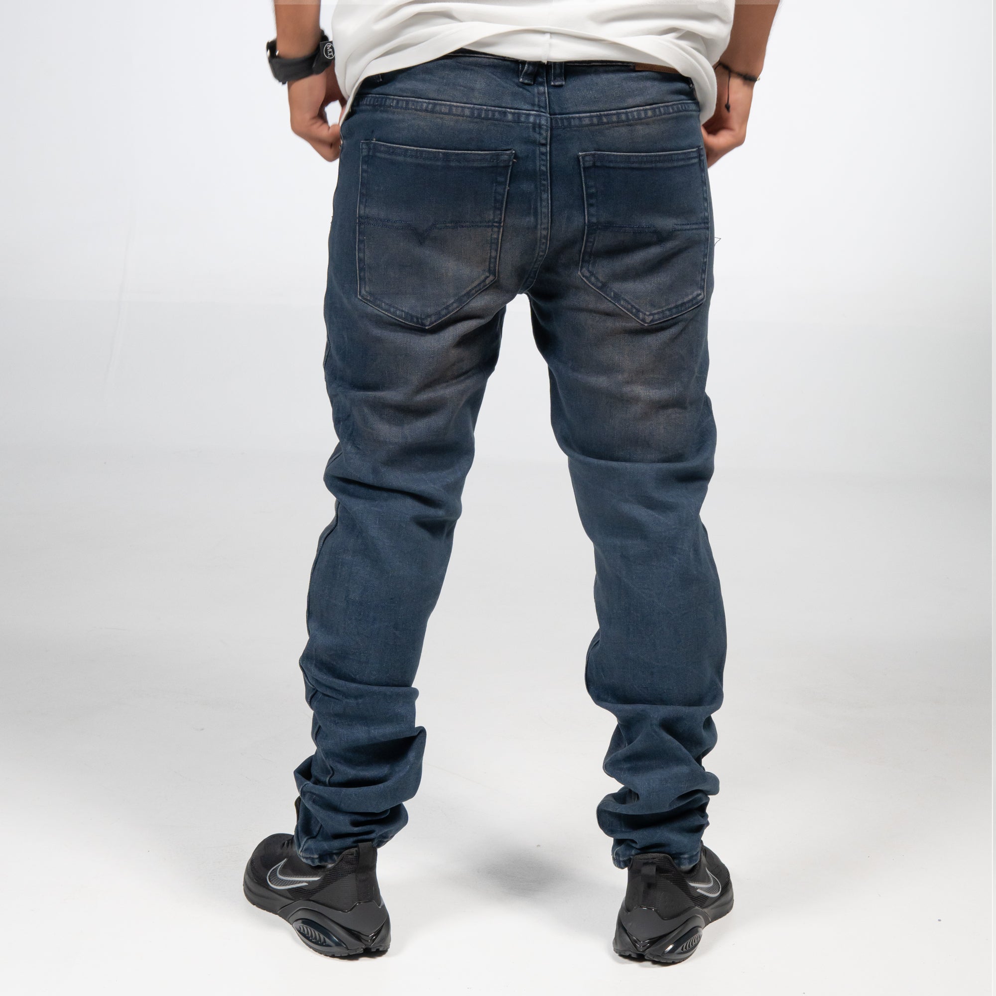 Jeans de corte entallado en azul oscuro con acabado desgastado sutil, tal como se muestra en la imagen. Perfectos para un estilo moderno y urbano, ofrecen un ajuste cómodo que estiliza la figura sin ser demasiado ceñidos.