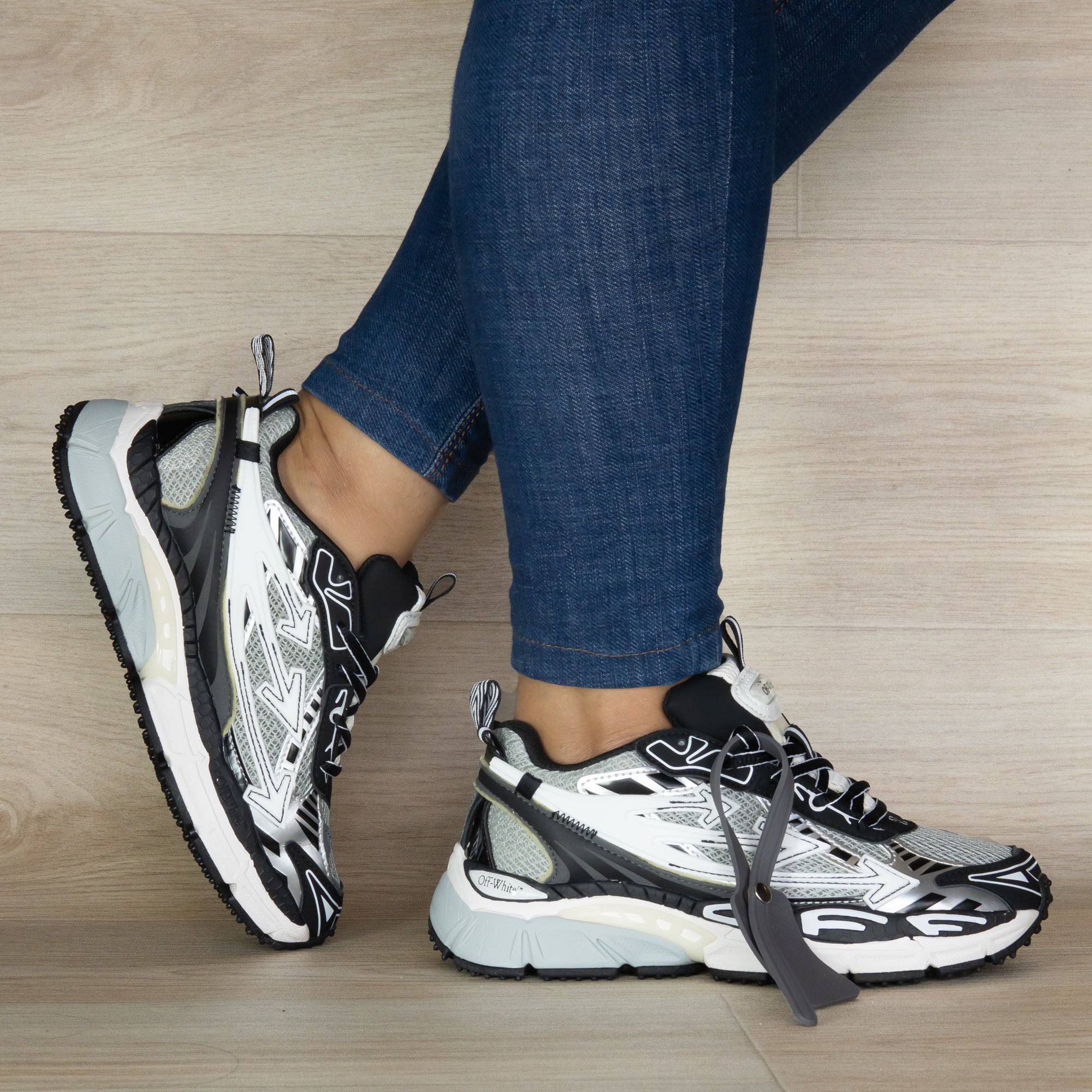 Una combinación armoniosa de grises en distintos matices, realzados con detalles en negro que aportan contraste y sofisticación. Paneles de malla respirable, cuero suave y capas de goma crean un acabado técnico, moderno y visualmente impactante, sin perder delicadeza.