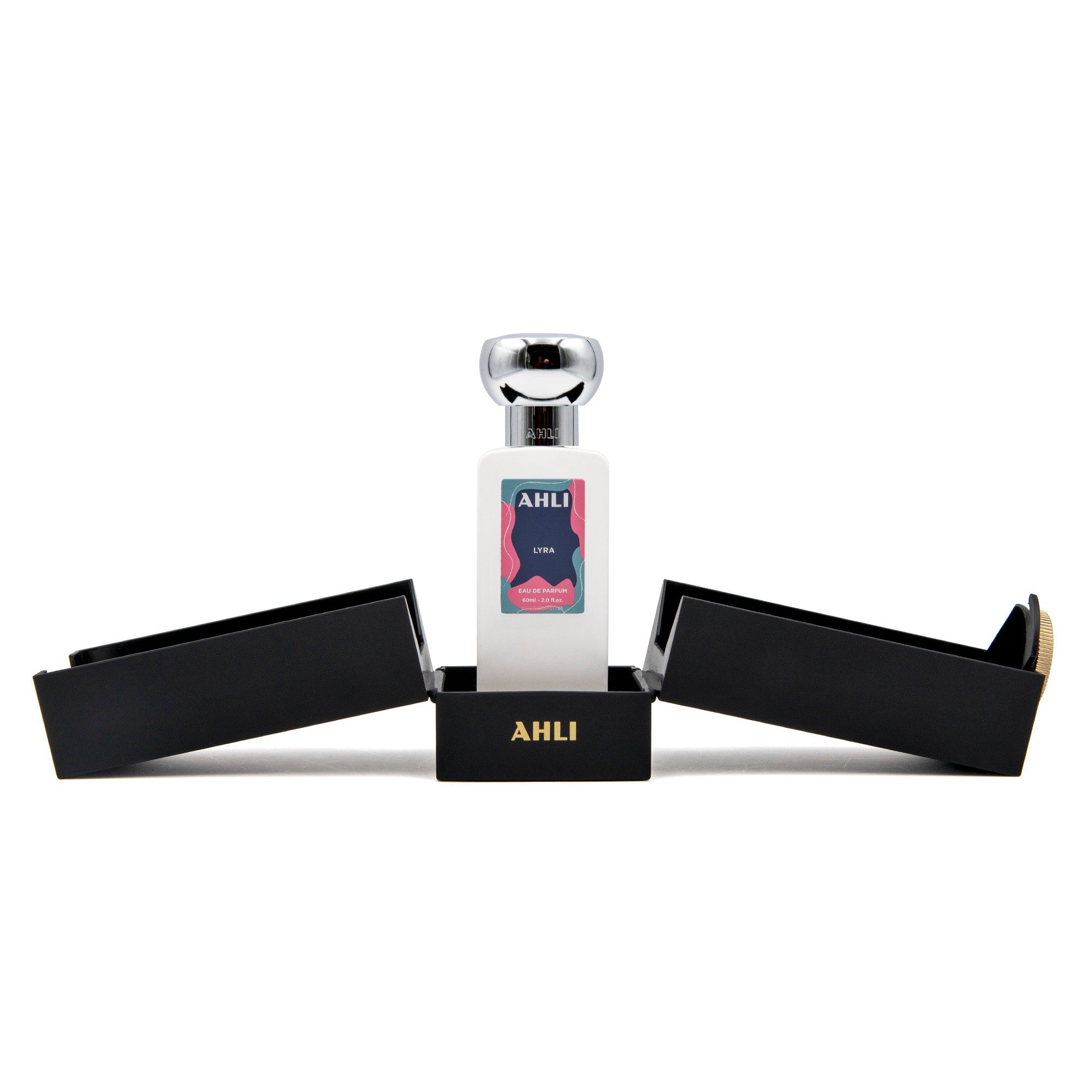 Abre con notas chispeantes de bergamota y manzana verde 🍏🍋, evoluciona a un corazón floral compuesto por violeta, jazmín y flor de naranjo 🌸, y se asienta en una base cálida y suave de ámbar gris y maderas ligeras 🌿🤍