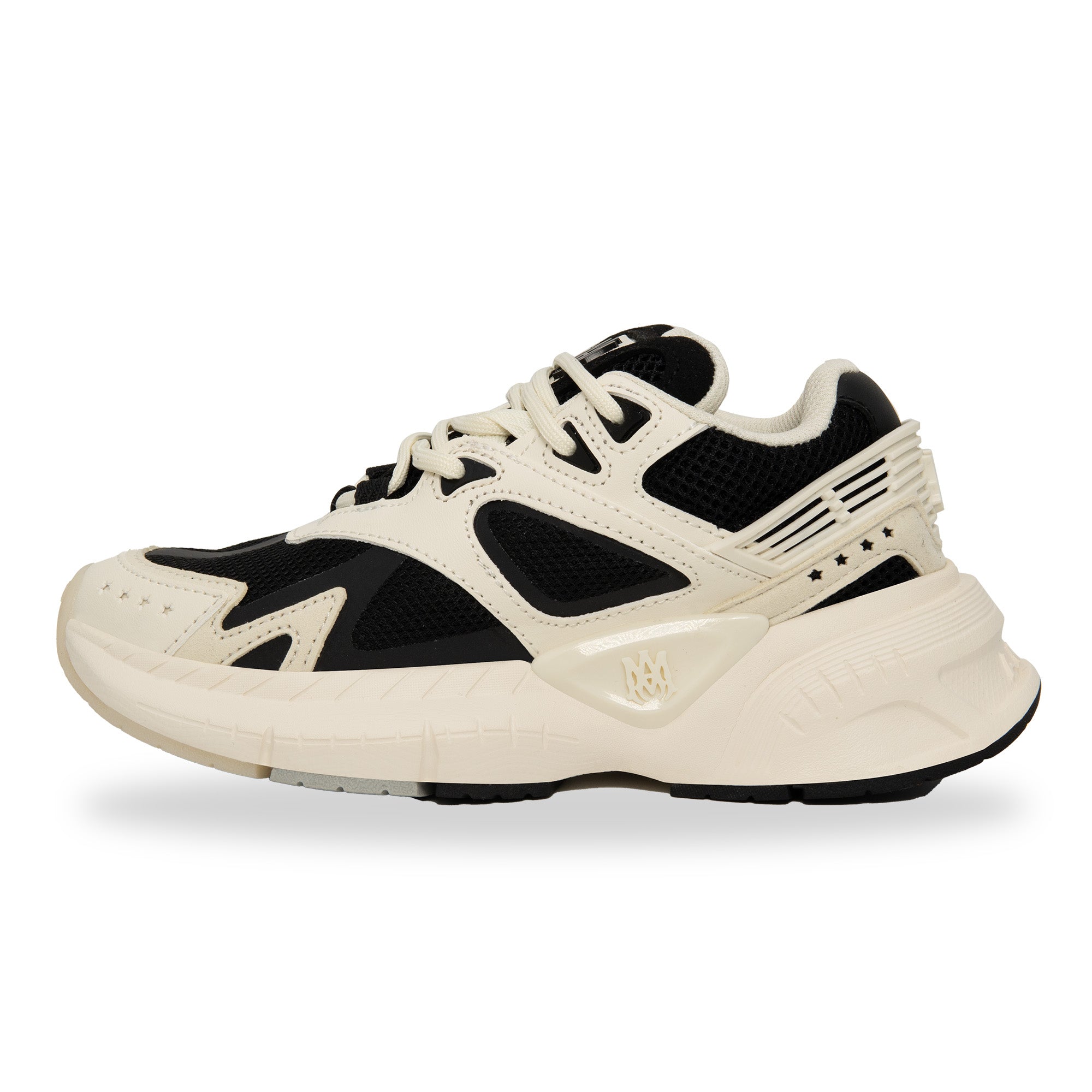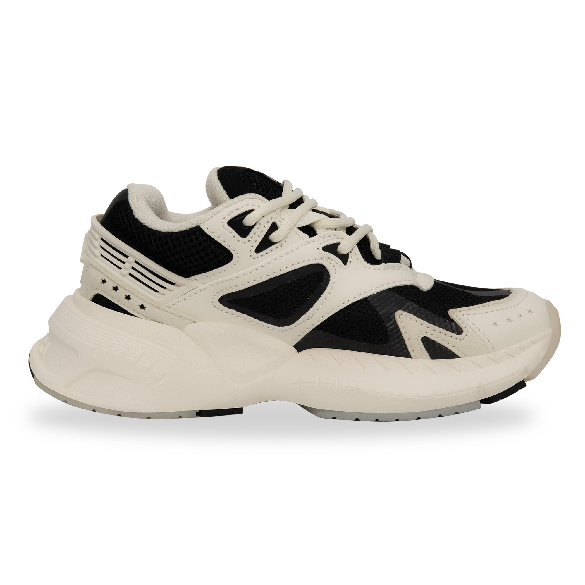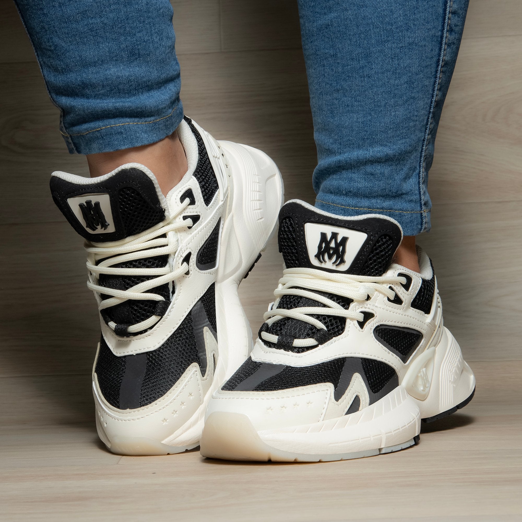 Base en malla blanca transpirable, capas de cuero negro premium y detalles en ante suave.