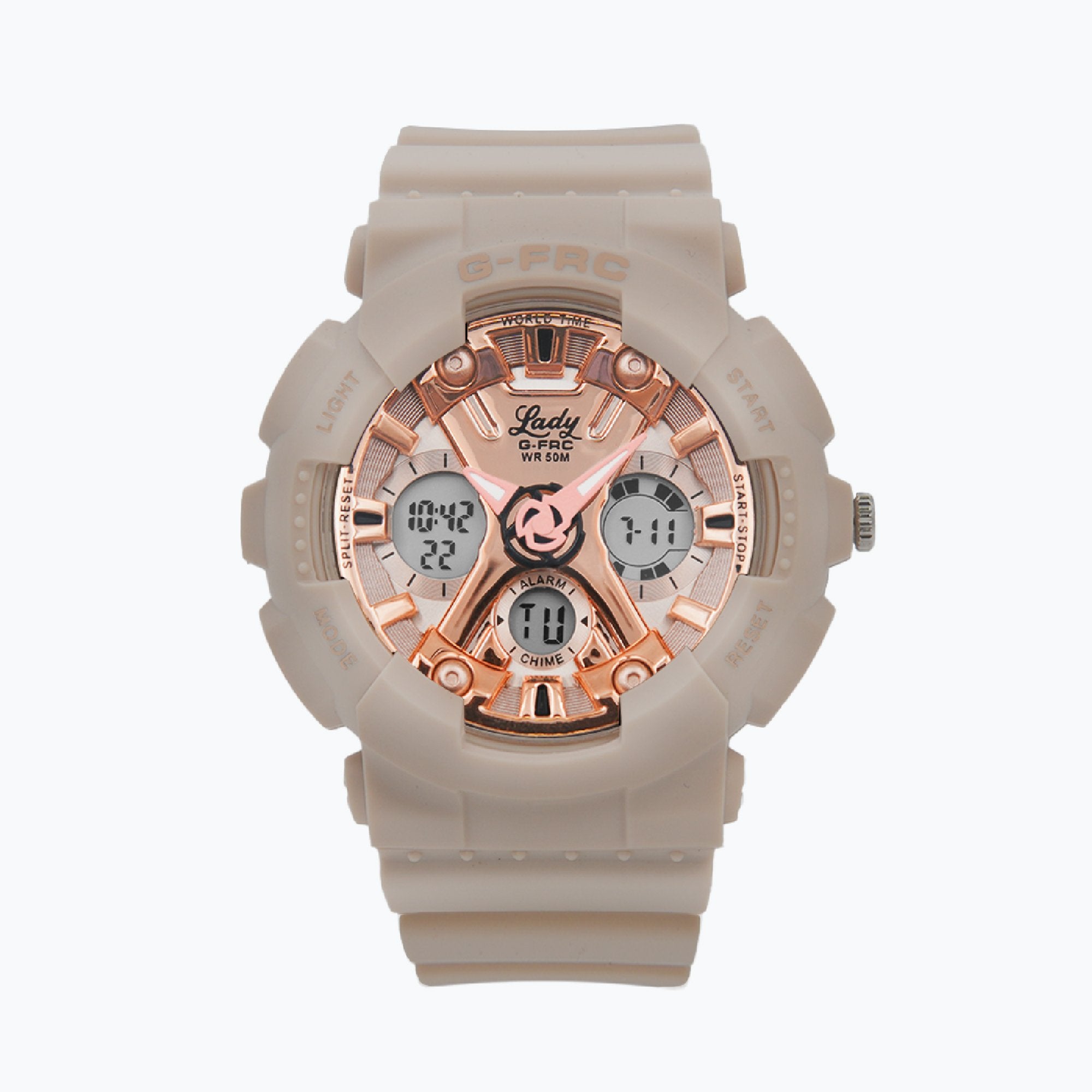 Un compañero confiable en cualquier momento del día. Un reloj práctico y elegante para todas las actividades El reloj incluye su estuche y tarjeta de garantía Color:beige Correa:beige – 17cm Doble hora,alarma,cronometro,fecha y luz led peso:46g