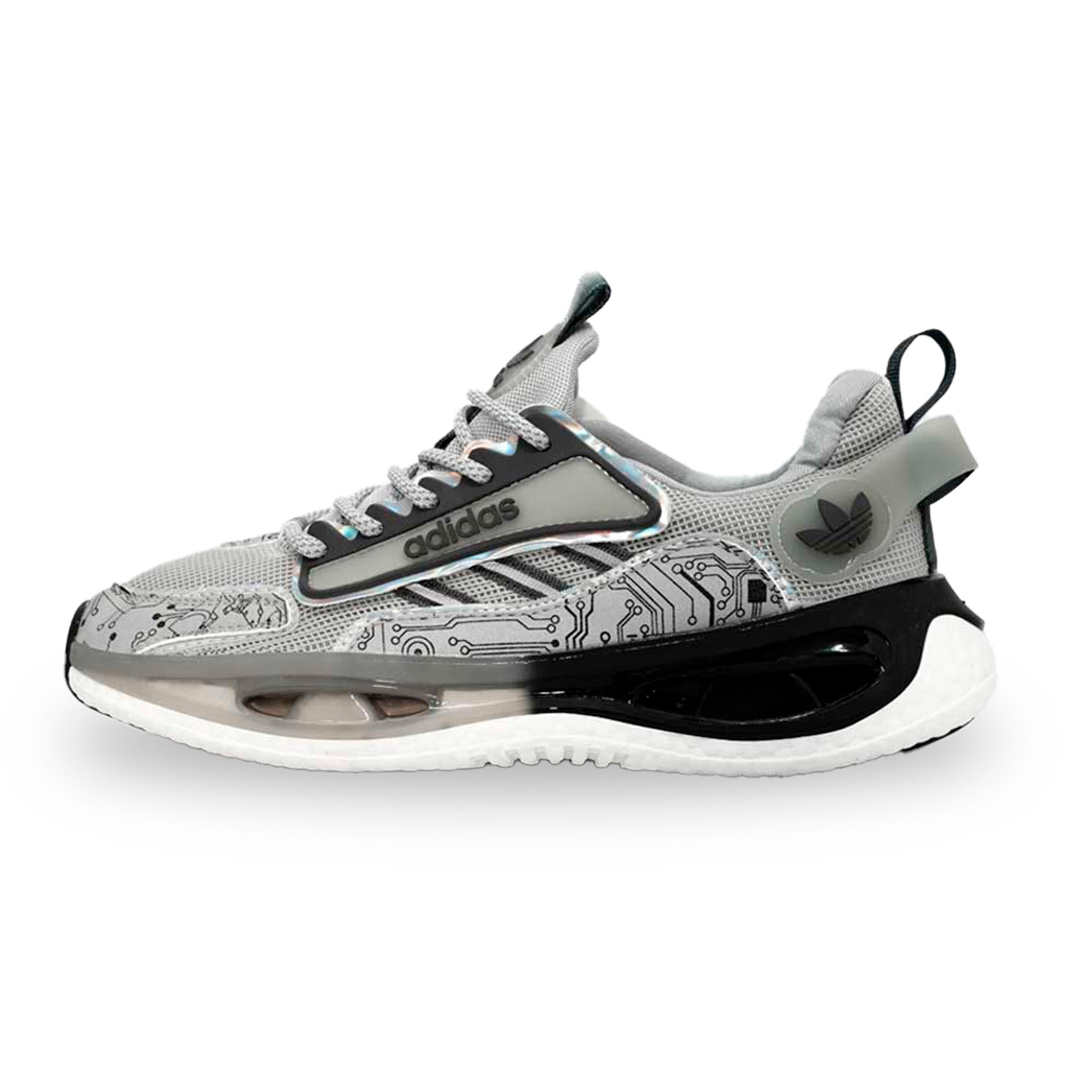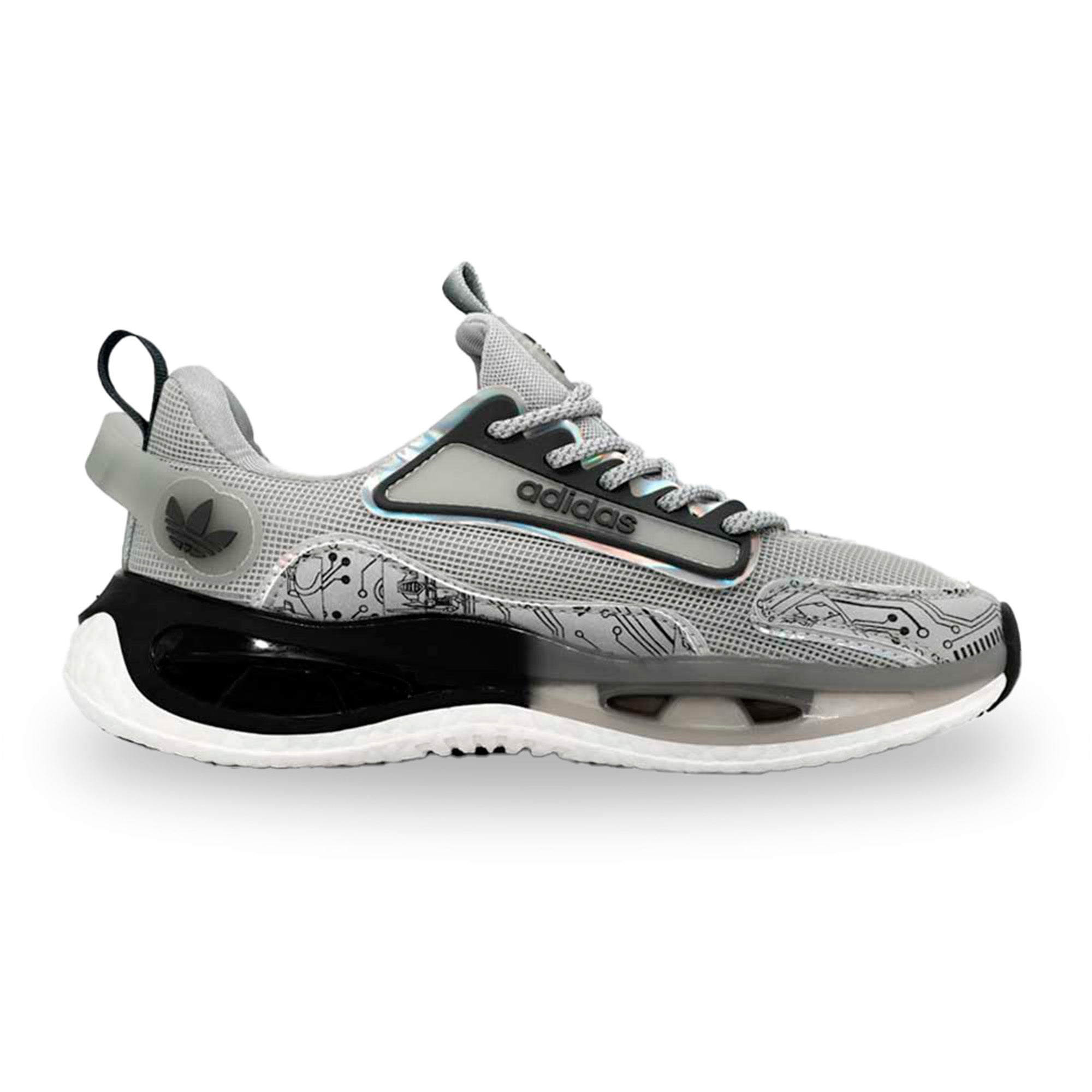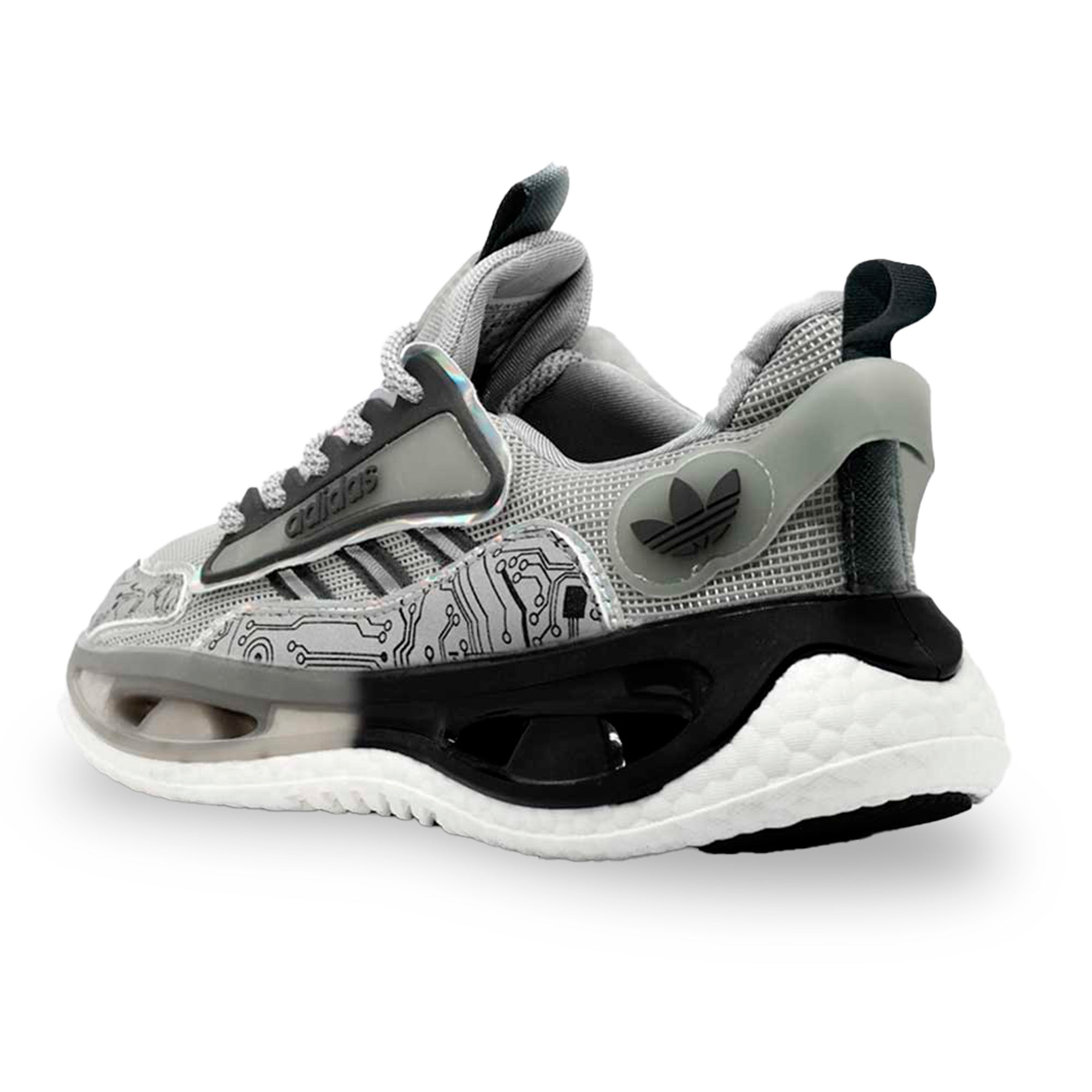 Malla gris de alta resistencia, transpirable y con refuerzo en talón y laterales. Detalles negros en contraste y líneas tipo “chip electrónico” que le dan un look de ciencia ficción.