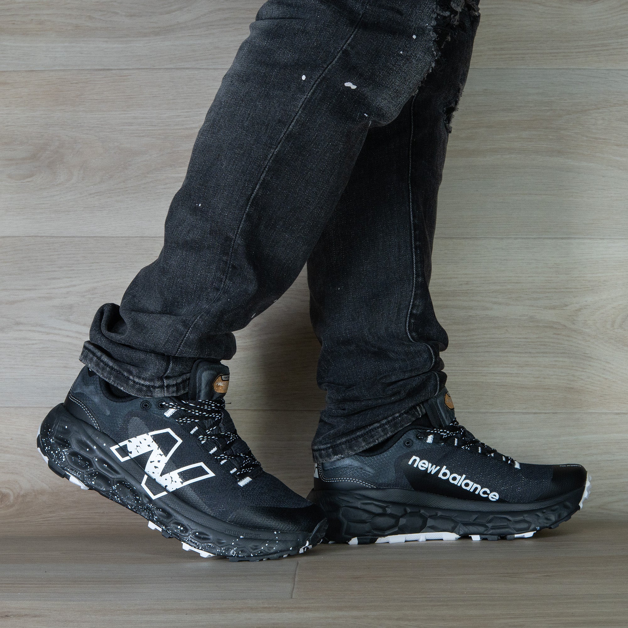 Capellada negra con toques blancos estratégicos que perfilan el diseño. Logo “N” moteado y una silueta firme que grita presencia.