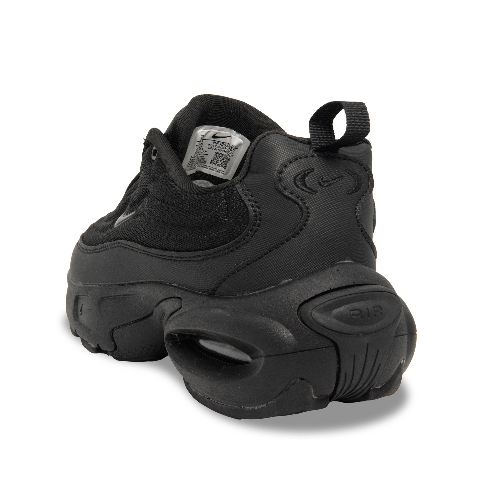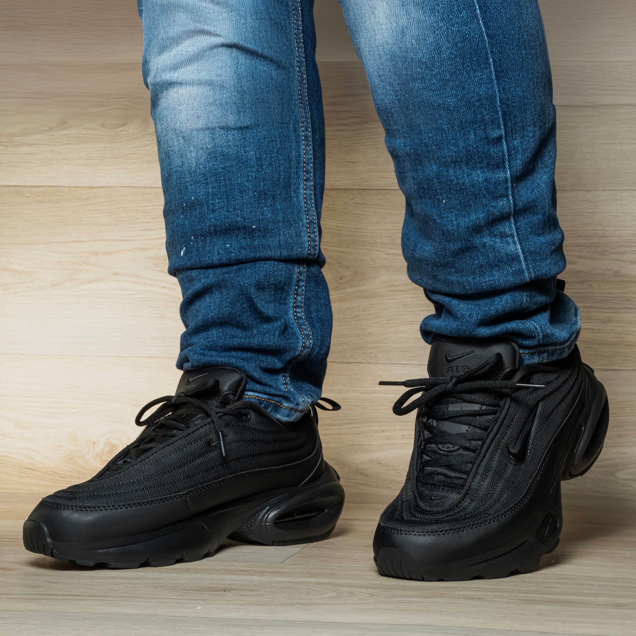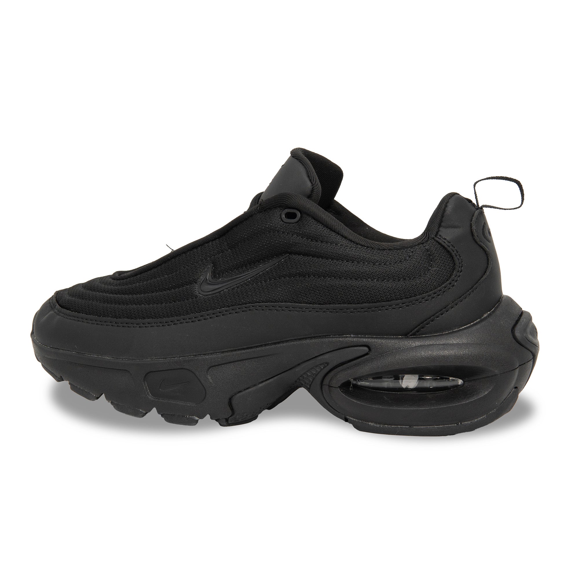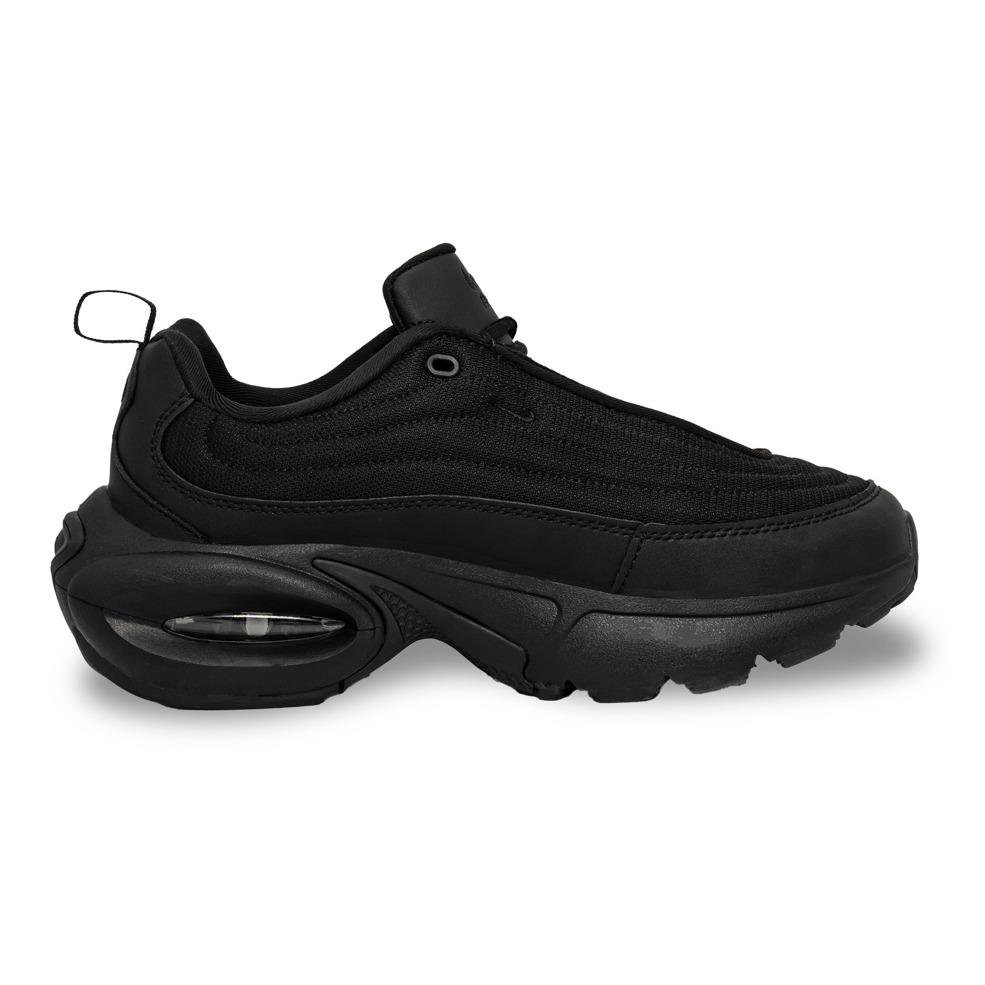 La cápsula de aire en el talón amortigua cada paso con suavidad. El diseño ovalado de la suela se fusiona en negro con el resto del par, creando una estética uniforme y moderna.