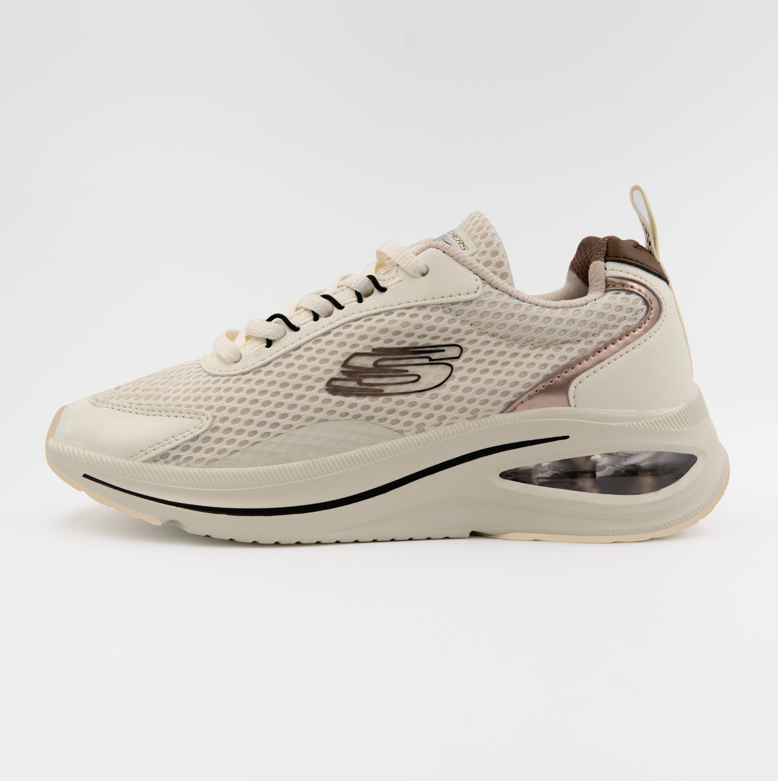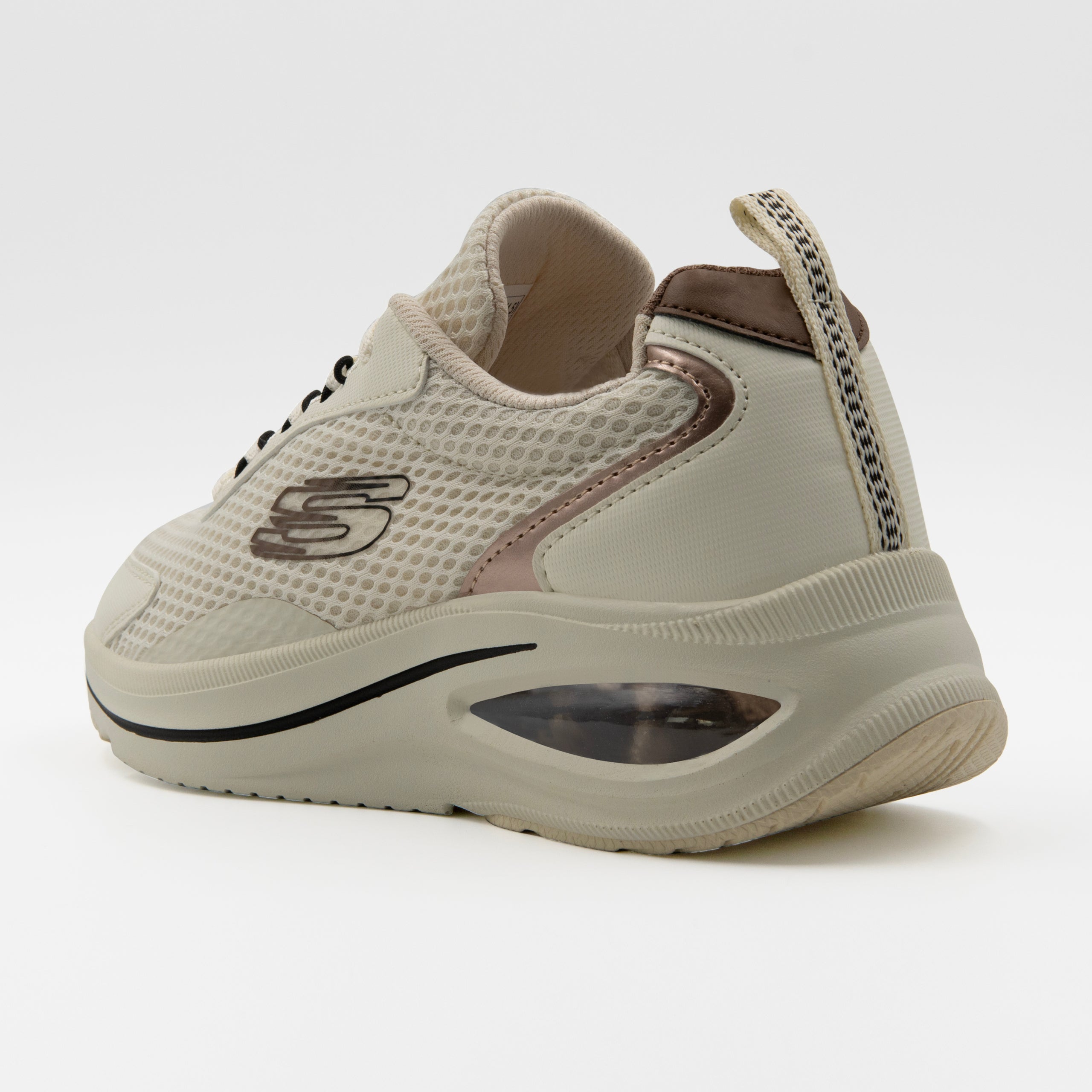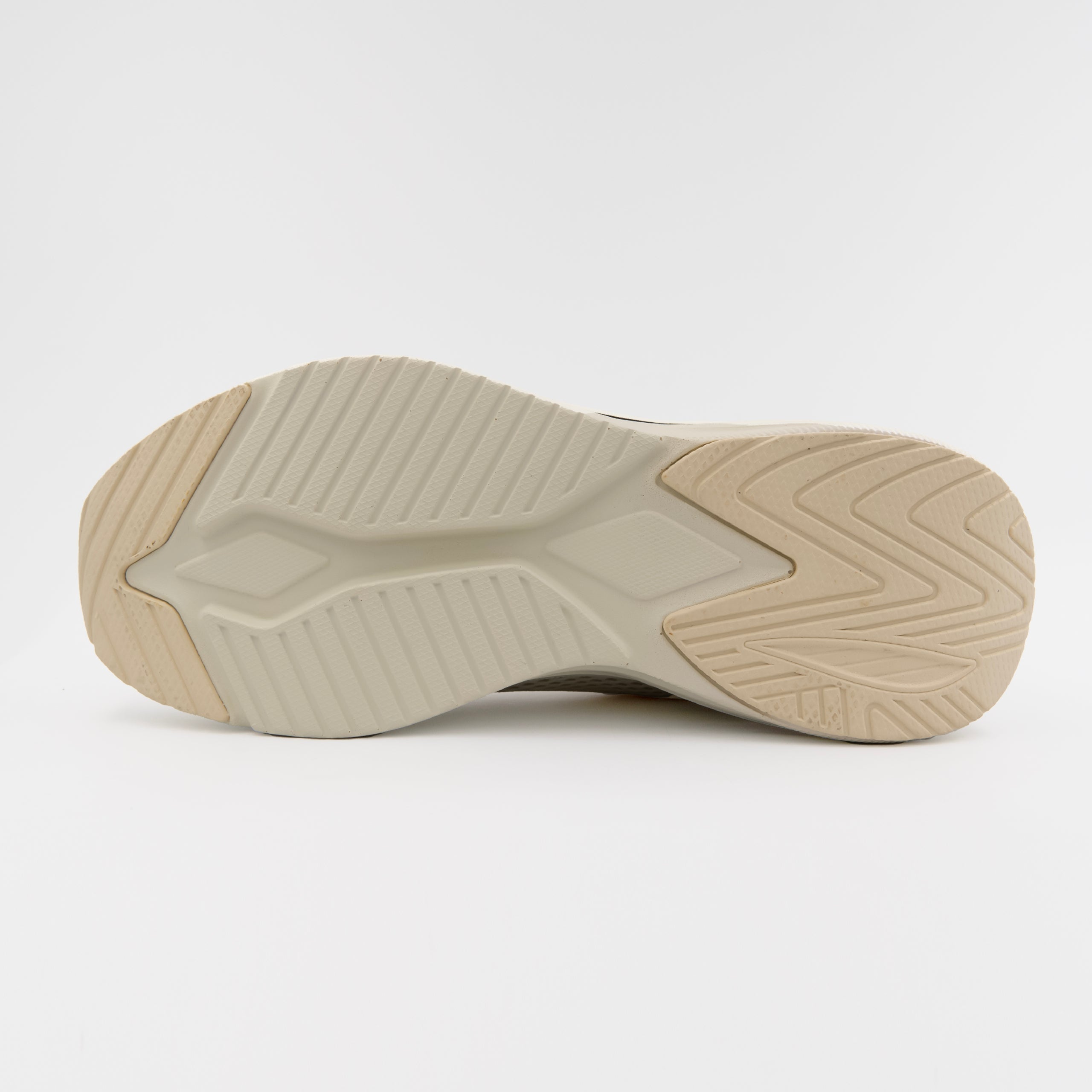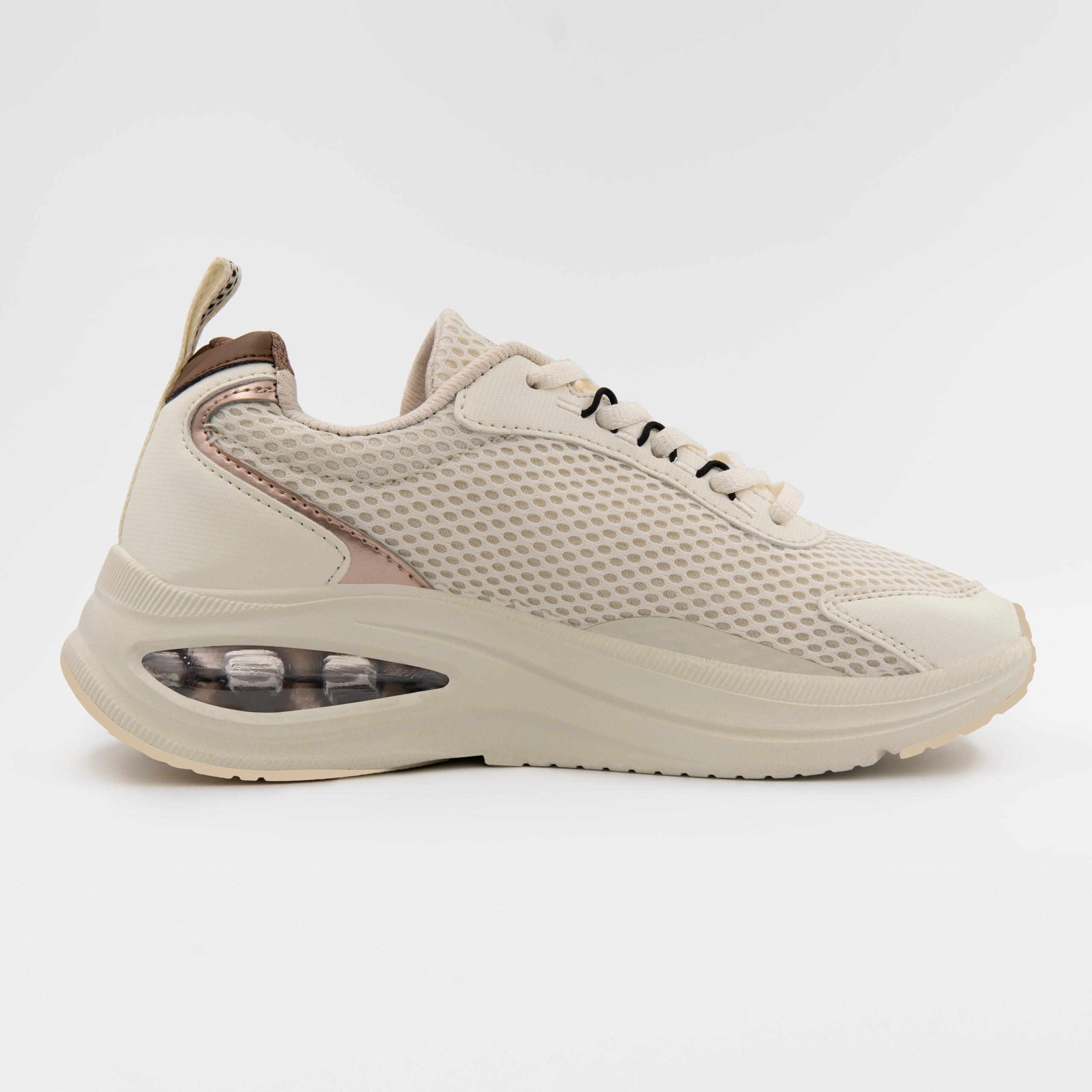 Tecnología de amortiguación con cámara trasera que ofrece una pisada ligera y suave. Suela beige con base antideslizante para pasos firmes.