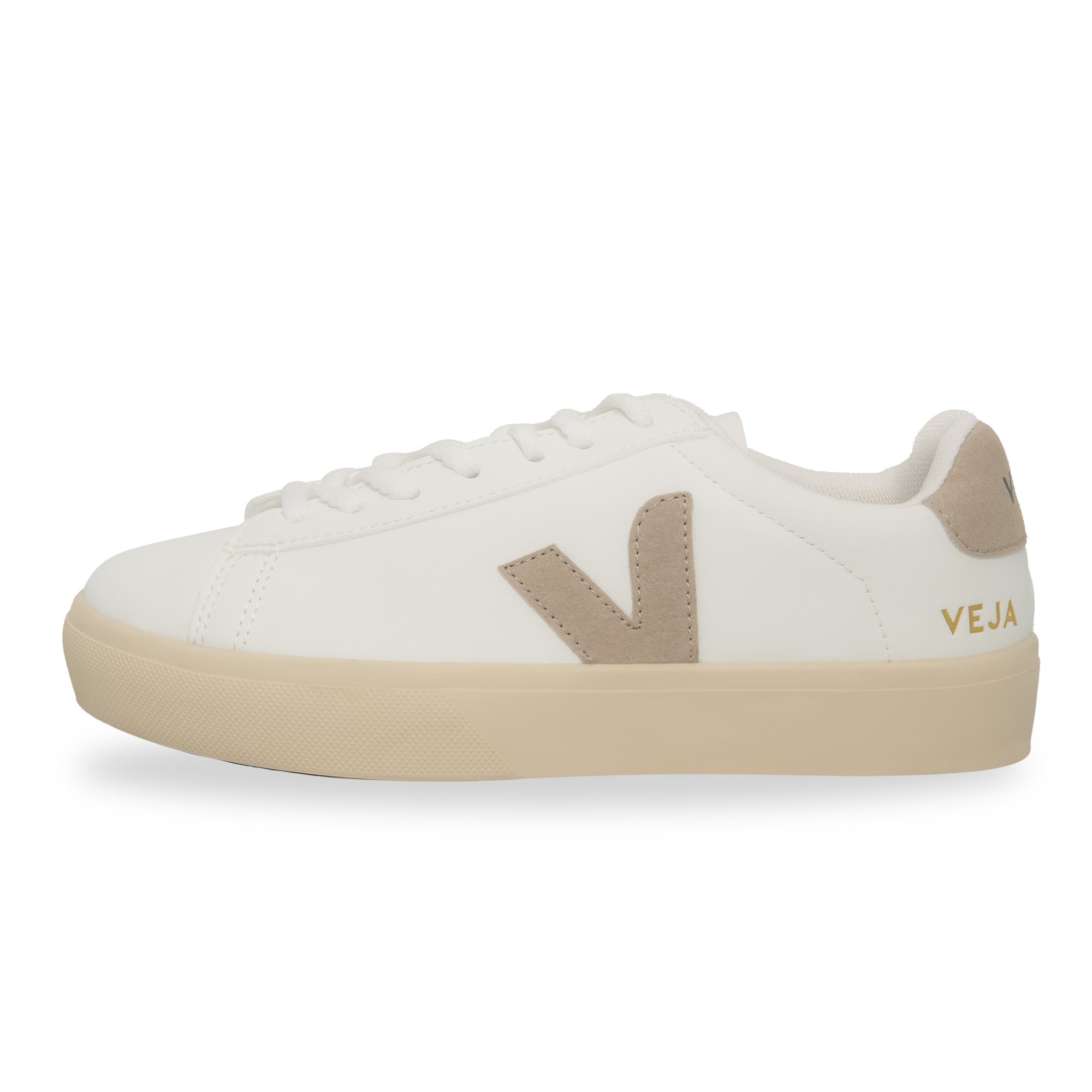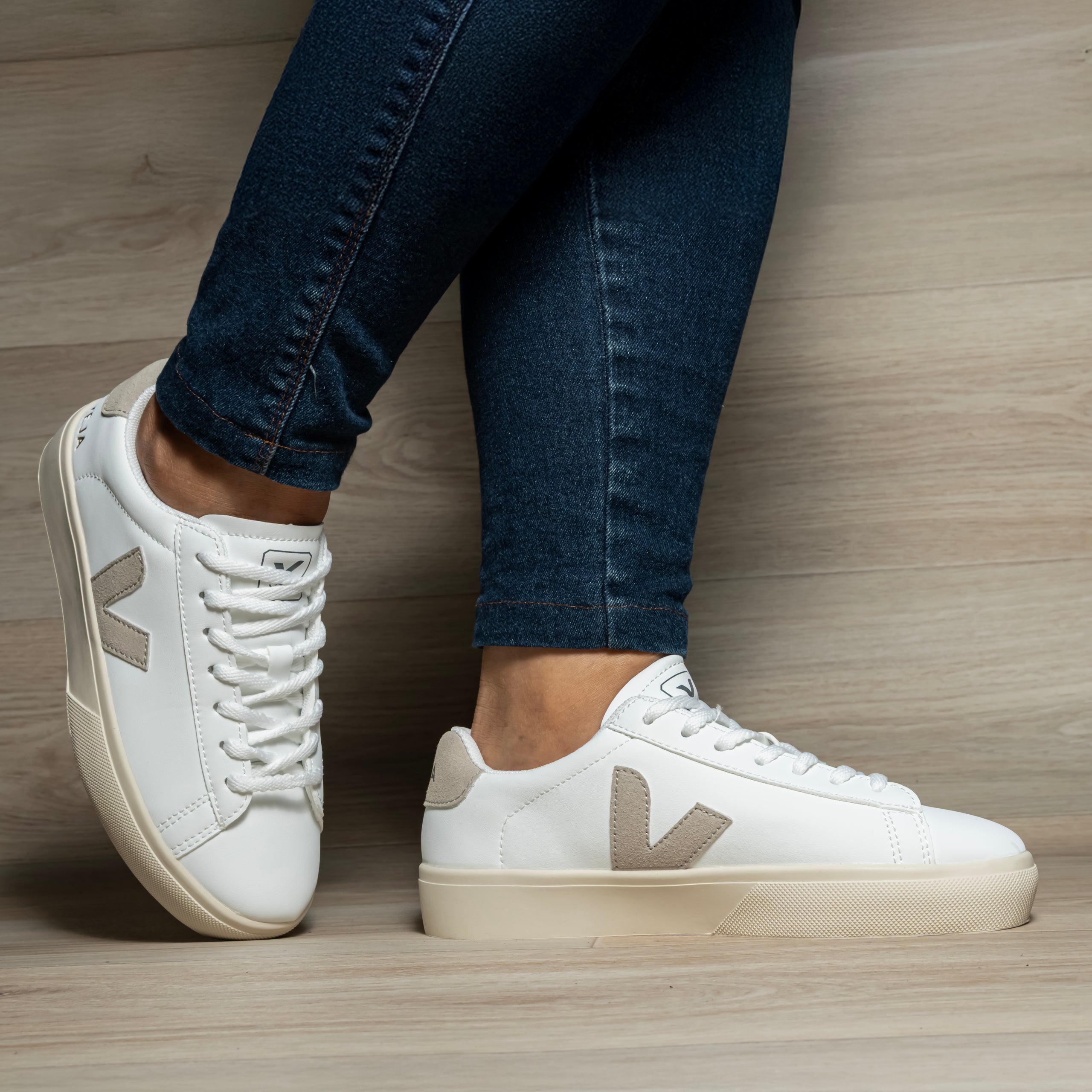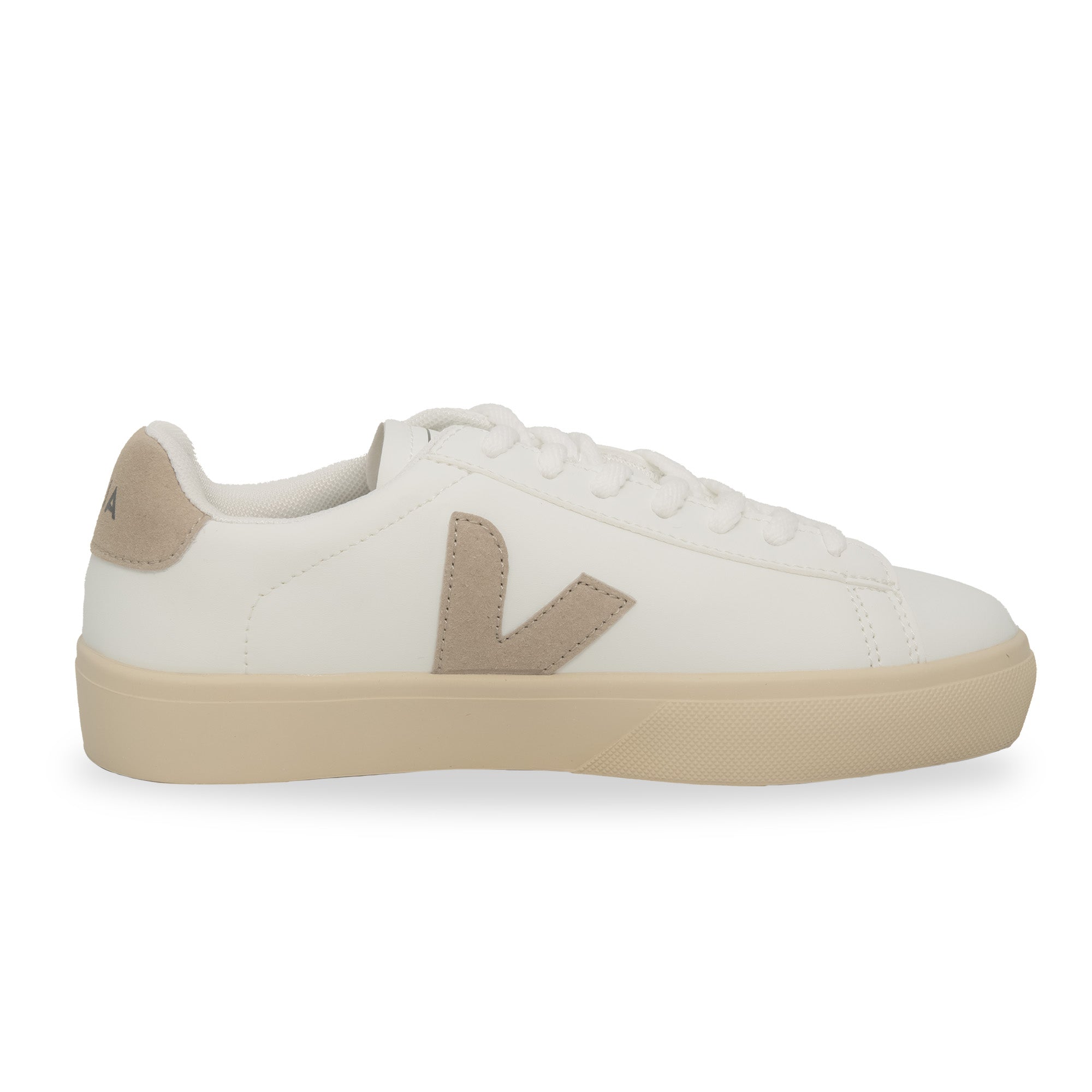 🧵 Exterior: Capellada en cuero ecológico blanco 🤍 con el icónico logo “V” en gris suave 🩶, elegante y discreto. Forro interior en algodón orgánico que aporta comodidad y transpirabilidad.