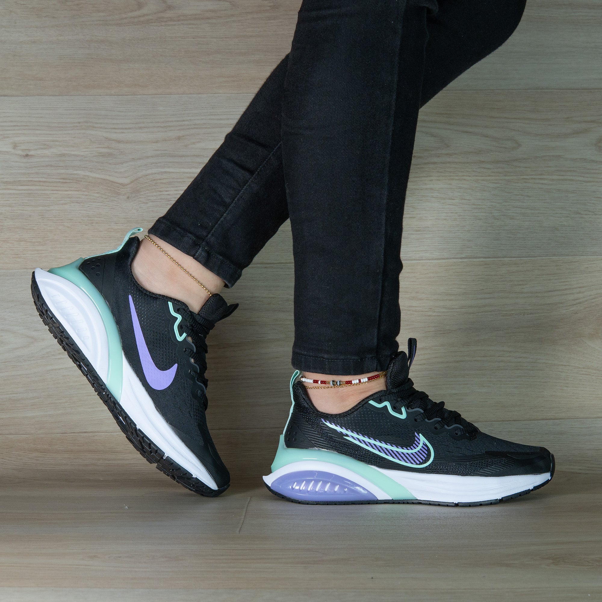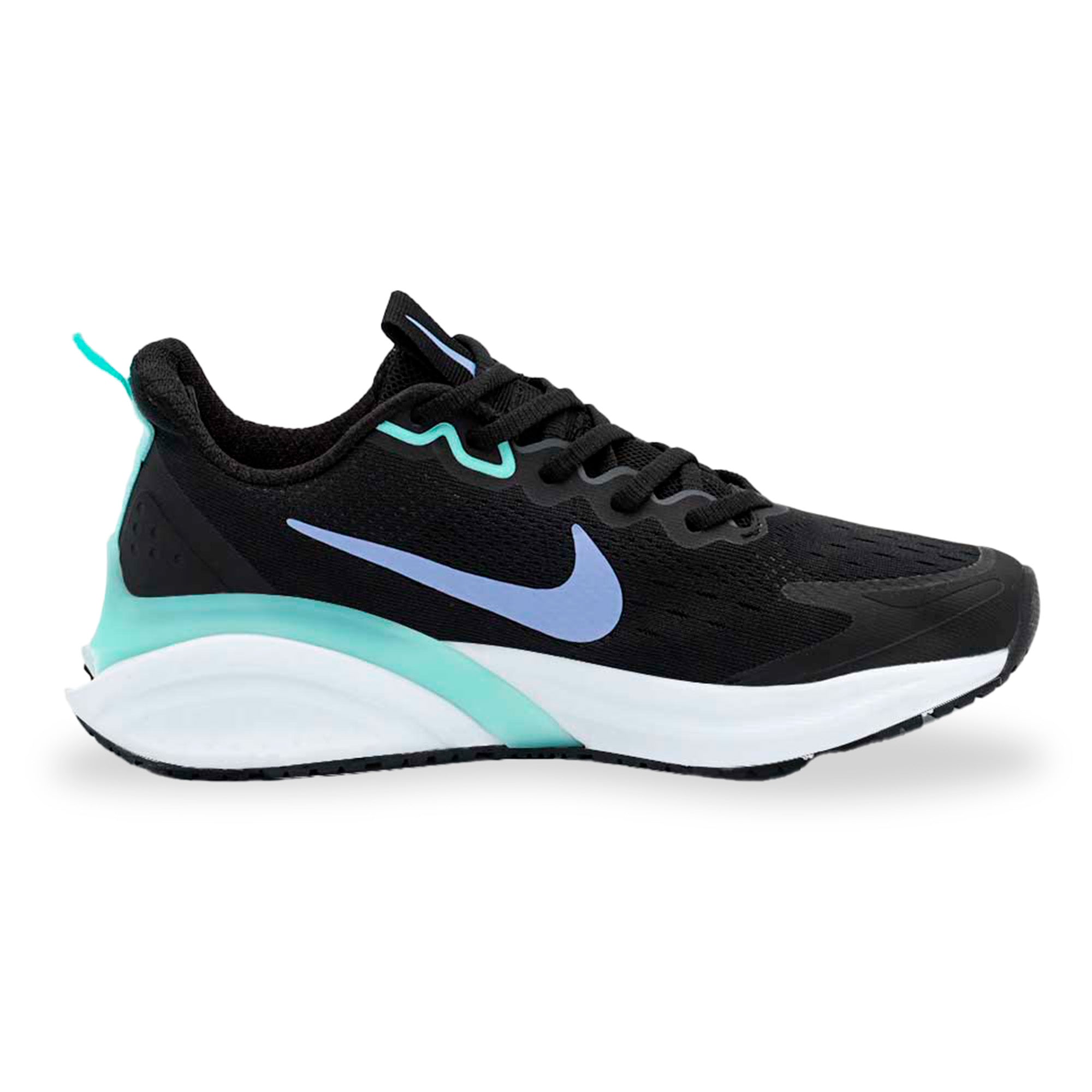 Este modelo combina lo mejor de la comodidad con una silueta futurista. Negro dominante, detalles aqua y un Swoosh con líneas azules que le dan ese toque dinámico y tecnológico.